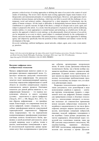 Основной целью статьи является ответ на вопрос, как можно подходить к определению действующего лица в современных реалиях, интерпретируемых как цифровая эпоха. Дается краткая характеристика цифрового, новейших цифровых технологий, характеризующихся использованием нейросетевых подходов в своем основании. Приводится критический обзор существующих подходов к определению статуса действующего лица в контексте социальных исследований техники. В ходе обзора показано, что основные существующие подходы главным образом сохраняют черты антропоцентрических и инструментальных принципов рассмотрения технологий. Однако такие подходы приводят к дихотомии человека и техники, что не вполне отвечает вызовам актуальных социальных и технических реалий, характеризующихся плотной встраиваемостью технологий в сферу человеческого бытия. Все это приводит к трудностям различения человеческого и технического вклада относительно конкретного результата. В свете данного тезиса предложена критика таких понятий, как актор, агент и субъект. В результате, с точки зрения практической деятельности и фундирующих ее современных реалий целесообразнее рассматривать человека и технологию как единое действующее лицо. В данной перспективе прочерчена связь с событийной онтологией, поскольку феноменально наблюдаемый результат деятельности может быть интерпретирован как событие, в котором квазисубъект конституируется в первую очередь положением наличного сущего, и границы действующего лица оказываются размыты. В статье предложена критика различных подходов к определению агентности и субъектности именно с позиций указанных оснований и намечены векторы развития темы.