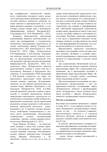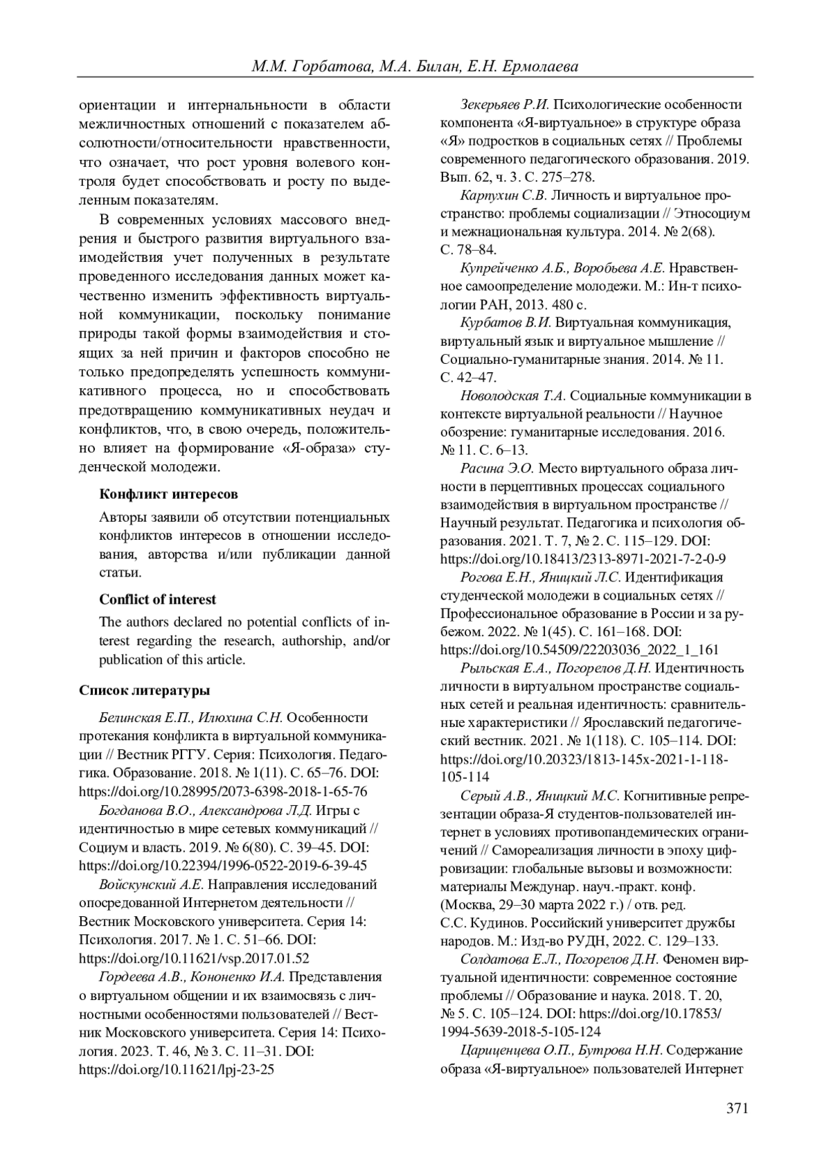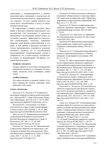 4. 	Гордеева А.В., Кононенко И.А. Представления о виртуальном общении и их взаимосвязь с личностными особенностями пользователей // Вестник Московского университета. Серия 14: Психология. 2023. Т. 46, № 3. С. 11-31. DOI: 10.11621/lpj-23-25 EDN: PFYYHP