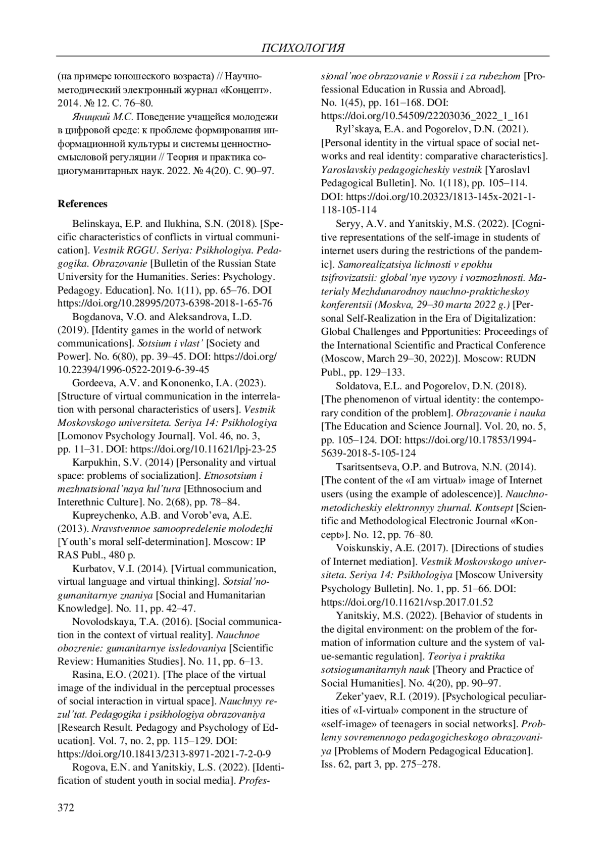 12. 	Рыльская Е.А., Погорелов Д.Н. Идентичность личности в виртуальном пространстве социальных сетей и реальная идентичность: сравнительные характеристики // Ярославский педагогический вестник. 2021. № 1(118). С. 105-114. DOI: 10.20323/1813-145x-2021-1-118-105-114 EDN: NWOKAP