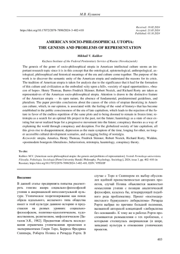 Статья посвящена генезису жанра социально-философской утопии в американской интеллектуальной культуре, что представляется весьма интересной темой для исследования, поскольку именно в утопии собираются воедино онтологические, гносеологические, антропологические, аксиологические, философско-исторические смыслы эпохи и культуры. Цель работы - обнаружить смысловое единство американской утопии и понять причины ее кризиса. Обращение к традиции американской утопии связано с тем значением, которое она имела для становления этой культуры и цивилизации как воплощенного «Града на холме», «Общества равных возможностей», «Маяка надежды». В качестве репрезентантов американской социально-философской утопии взяты Генри Торо, Беррес Фредрик Скиннер, Роберт Нозик и Ричард Рорти. Обращается внимание на отличительную черту американской утопии - ее открытый характер, отсутствие фундаментальных, заранее предопределенных установок, плюралистичность. Сделаны выводы о причинах кризиса утопического теоретизирования в американской культуре, что, на наш взгляд, связано с утвердившимся в общественном сознании эпохи позднего капитализма ощущением «конца истории», которое приводит к отказу от будущего в пользу бесконечного повторения одних и тех же сюжетов и обреченности на пребывание в застывшем времени; ретротопией как поиском оптимального жизненного проекта в прошлом, а не будущем; хонтологией как состоянием некогда бытовавшей, но так и не сбывшейся надежды на прогрессивное движение в будущее; конспирологией как способом объяснения мира через заговор и обман. Все это порождает разочарование для глобализированного общества позднего капитализма, депрессию как основной симптом времени, тоску по другим, уже недоступным сценариям развития культуры, щемящее чувство ностальгии.