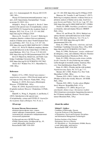 12. 	Mancosu М., Vassallo S., Vezzoni C. Believing in conspiracy theories: evidence from an exploratory analysis of Italian survey data // South European Society and Politics. 2017. Vol. 22, iss. 3. P. 327-344. DOI: 10.1080/13608746.2017.1359894