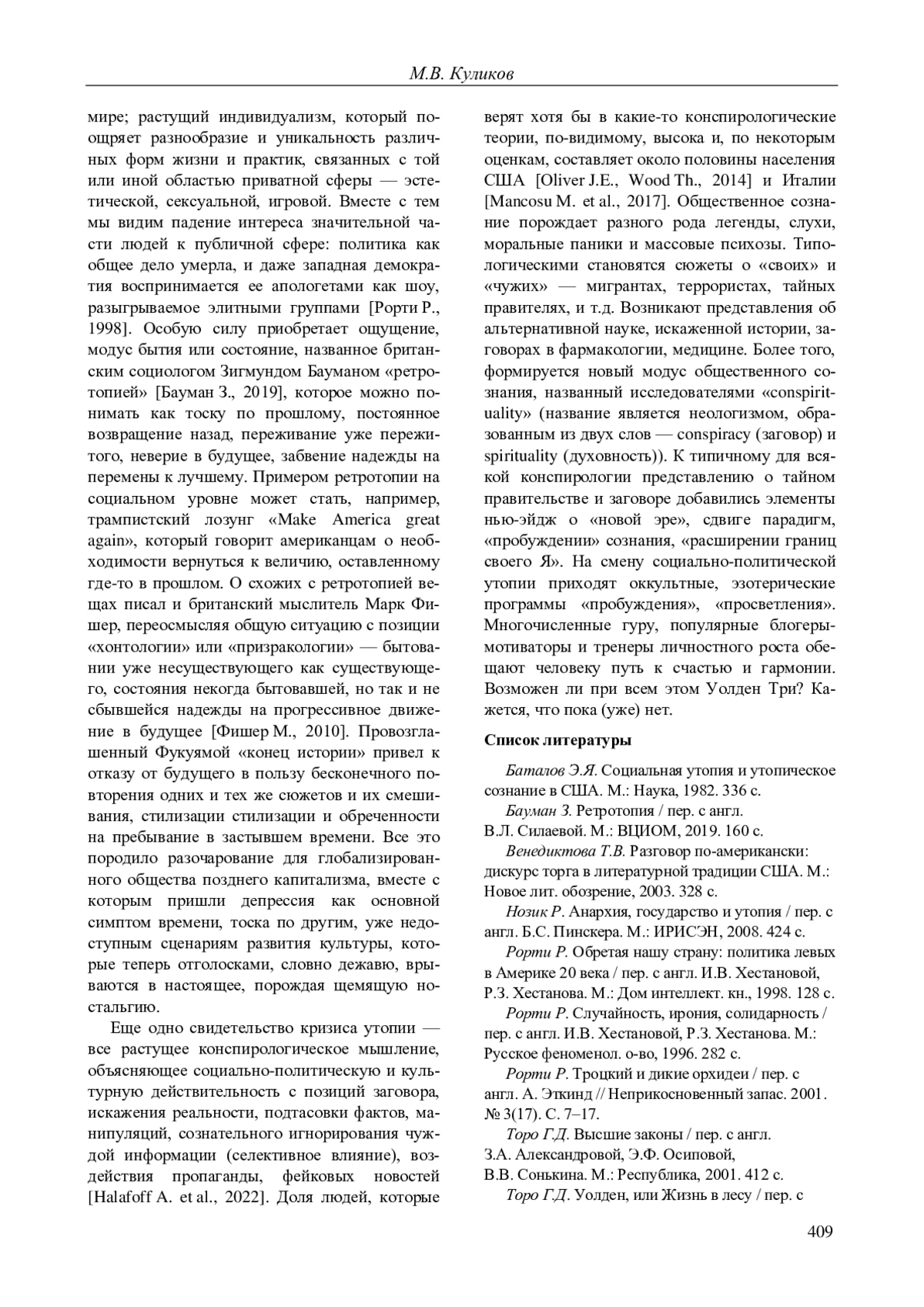 1. 	Баталов Э.Я. Социальная утопия и утопическое сознание в США. М.: Наука, 1982. 336 с.