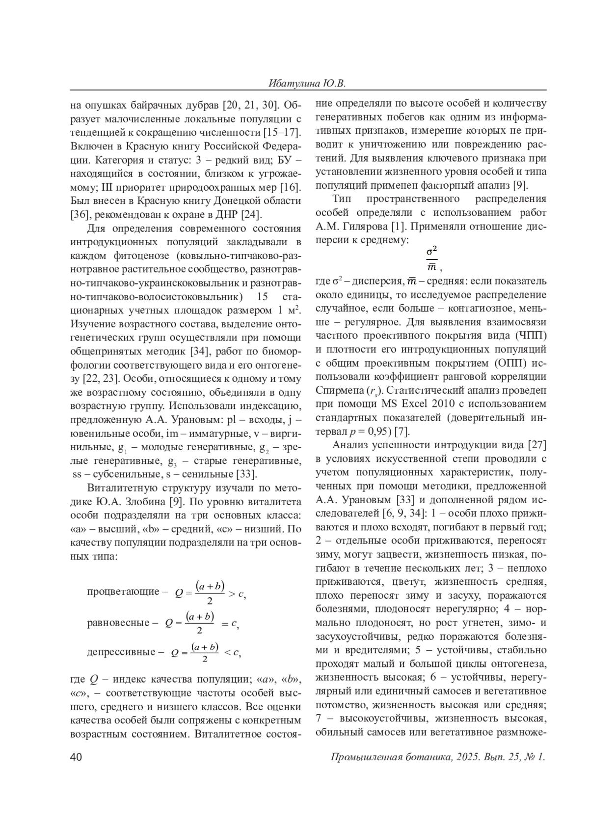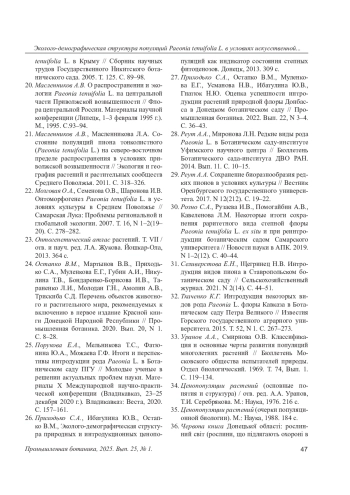 10. Ибатулина Ю.В. Натурные модели настоящей степи в Донецком ботаническом саду и некоторые итоги анализа состояния интродукционных популяций в их условиях // Научные труды Чебоксарского филиала Главного ботанического сада им. Н.В. Цицина РАН. 2023. N 19. С. 35-38.