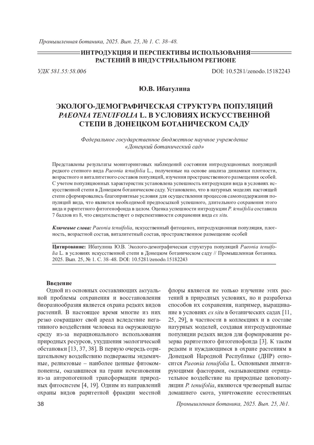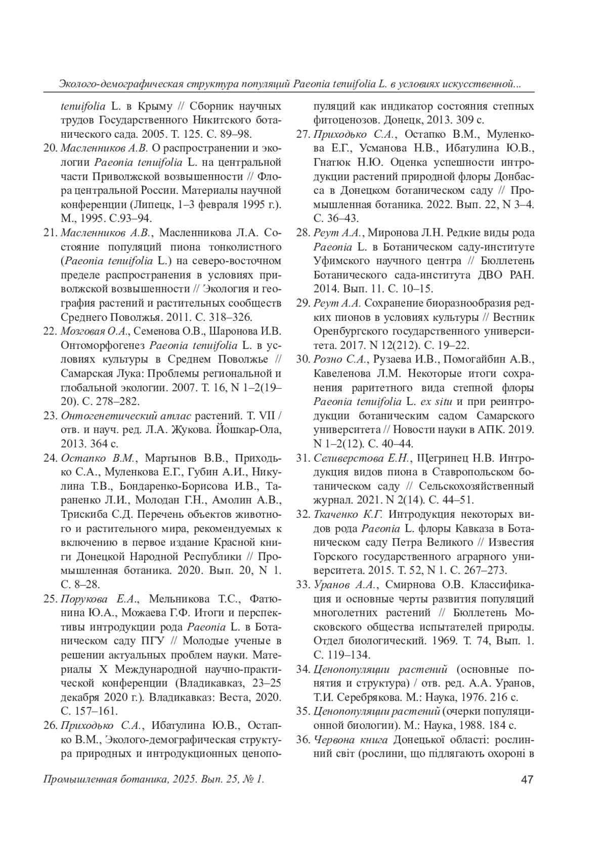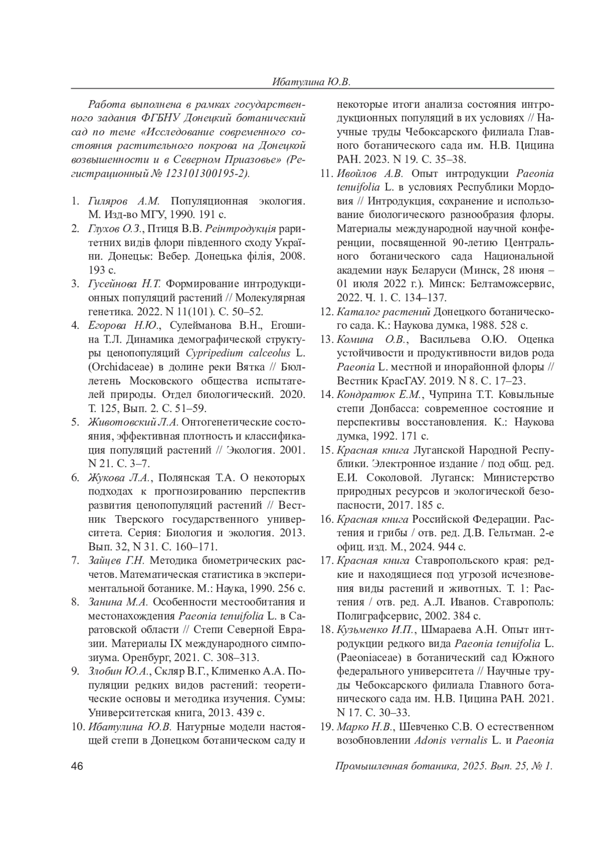 38. Zanina M.A., Smirnova E.B. Structure of coenopopulations and phytocoenotic confinement of Paeonia tenuifolia L. in floristic complexes of Oka-Don lowland // Plant Science Today. 2020. Vol. 7, N 4. P. 663-668.