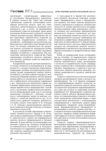 В продолжение данной трактовки компетентности можно сослаться на исследование В. Д. Шадрикова [7], в котором компетенции представлены следующими группами: инструментальные компетенции (знания определенной учебной области, способность участника учебного процесса к мыслительным операциям анализа и синтеза, базовые умения работы за компьютером, навыки управления и эффективного использования информации и др.), межличностные компетенции (навыки выполнения эффективной деятельности в команде, навыки межличностных взаимодействий, способность к выполнению профессиональной деятельности в международной среде и др.) и системные компетенции (способность к обучению, способность к использованию знаний на практике, способность к проектной деятельности и др.). В качестве итога подобного понимания компетентности может служить точка зрения Л. М. Спенсера и С. М. Спенсера, рассматривающих компетентность студентов в качестве основного устойчивого компонента личности [8].