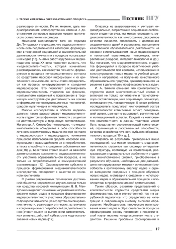 В статье рассматриваются теоретические аспекты медиакомпетентности студентов в системе высшего образования в контексте отечественных и зарубежных исследований. Отмечается, что перед системой высшего образования в качестве вектора дальнейшего ее развития ставится задача обеспечения условий успешного формирования профессиональной компетентности выпускников, ориентированной на творческое саморазвитие в информационно-коммуникационной среде. Авторы рассматривают сущность медиакомпетентности студентов, а также особенности ее структуры с учетом условий современной системы высшего образования. В статье представлены компоненты, составляющие медиакомпетентность студентов. Авторы приходят к выводу, что медиакомпетентность студентов формируется в процессе практической учебной деятельности при контакте, использовании и конструировании новых медиа по учебной дисциплине и направлена на получение качественного образовательного продукта, ориентированного на решение в дальнейшем профессиональных задач.