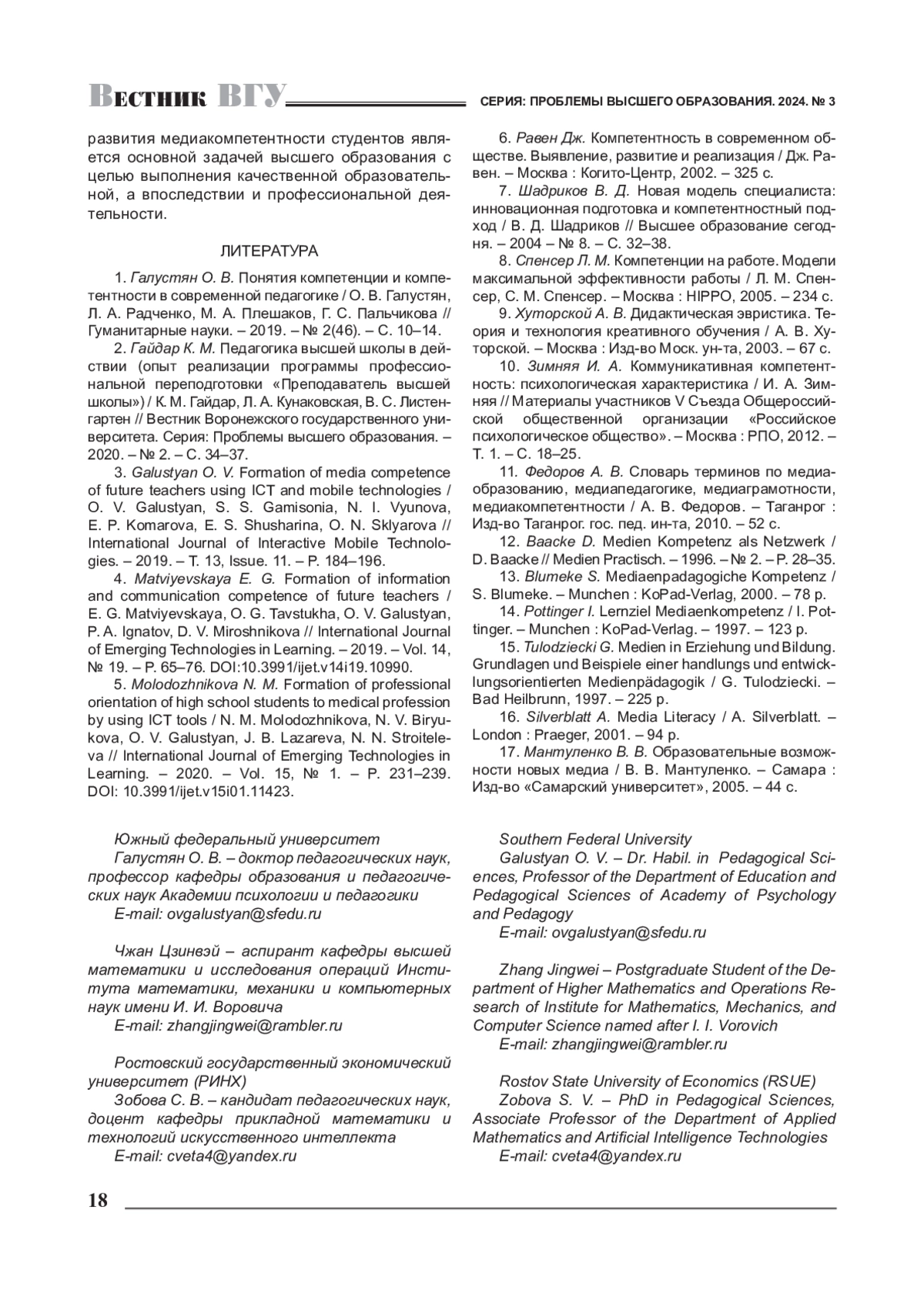 3. 	Galustyan O. V. Formation of media competence of future teachers using ICT and mobile technologies / O. V. Galustyan, S. S. Gamisonia, N. I. Vyunova, E. P. Komarova, E. S. Shusharina, O. N. Sklyarova // International Journal of Interactive Mobile Technologies. - 2019. - T. 13, Issue. 11. - P. 184-196. EDN: HDXXPM