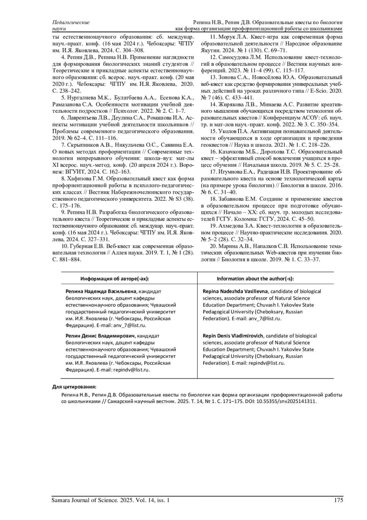 9. Репина Н.В. Разработка биологического образовательного квеста // Теоретические и прикладные аспекты естественнонаучного образования: сб. междунар. науч.-практ. конф. (16 мая 2024 г.). Чебоксары: ЧГПУ им. И.Я. Яковлева, 2024. С. 327-331. EDN: AQEITZ