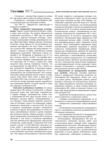 7. 	Константинова Л. В. Генеративный искусственный интеллект в образовании: дискуссии и прогнозы / Л. В. Константинова, В. В. Ворожихин, А. М. Петров, Е. С. Титова, Д. А. Штыхно // Открытое образование. - 2023. - № 2. - URL: https://cyberleninka.ru/article/n/generativnyy-iskusstvennyy-intellekt-v-obrazovanii-diskussii-i-prognozy (дата обращения: 22.06.2024). EDN: VPMIZK