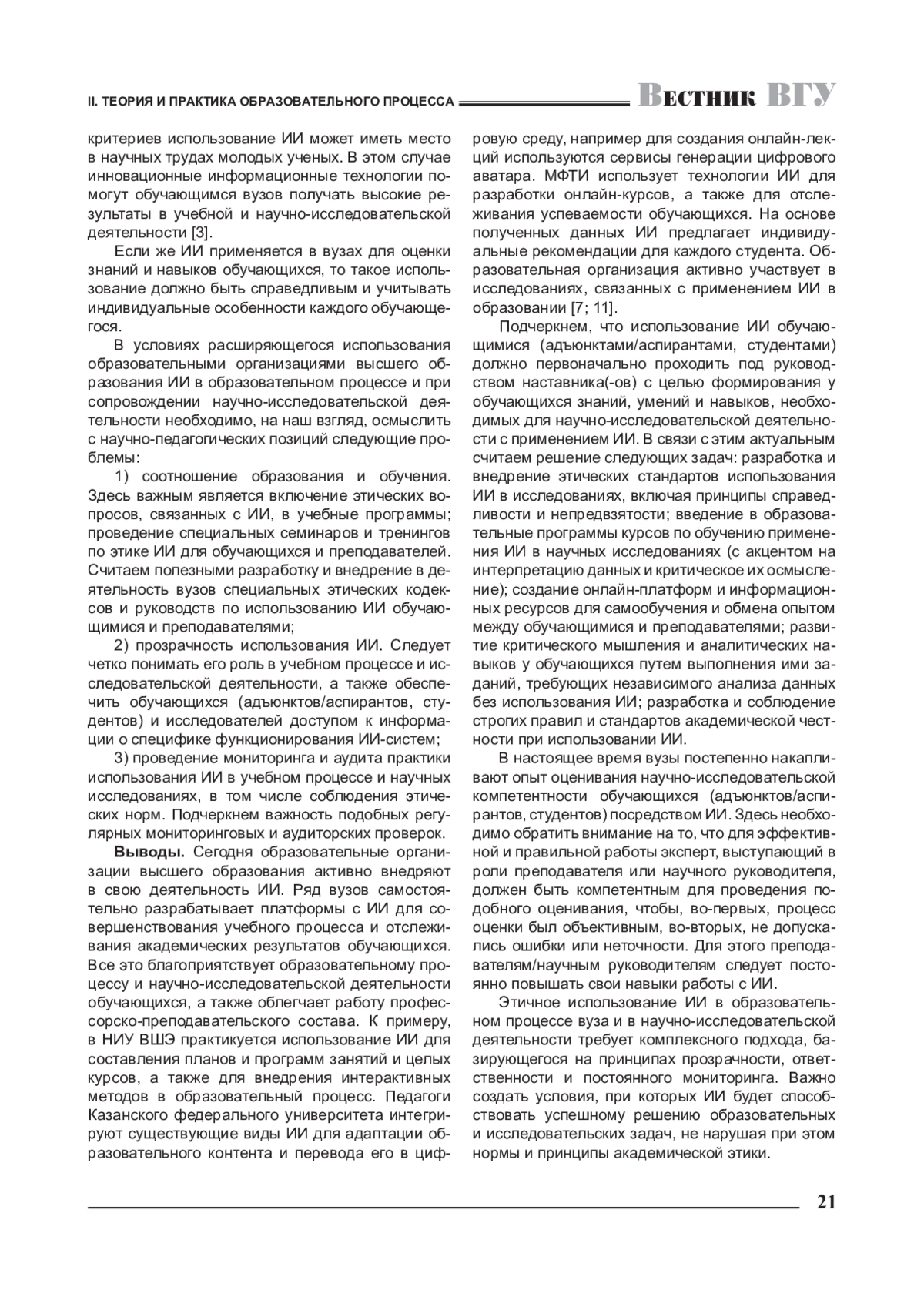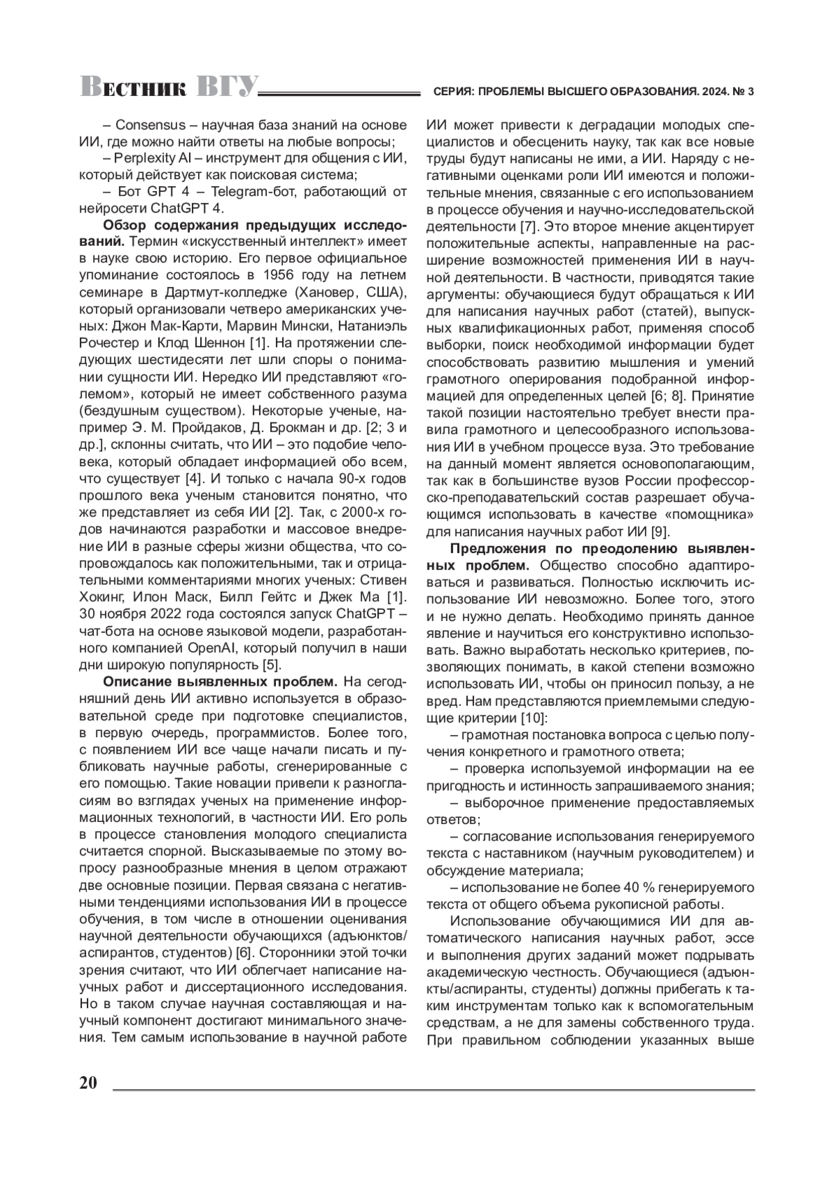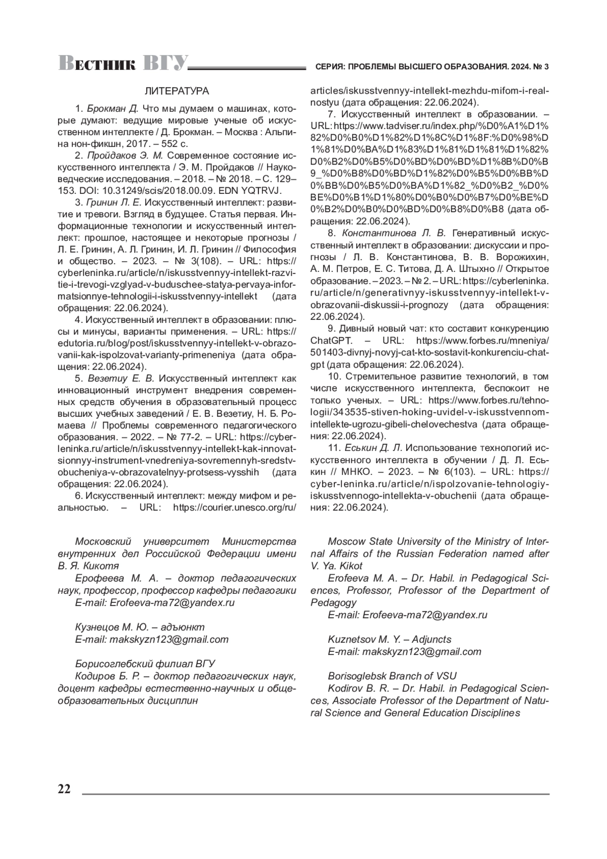 5. 	Везетиу Е. В. Искусственный интеллект как инновационный инструмент внедрения современных средств обучения в образовательный процесс высших учебных заведений / Е. В. Везетиу, Н. Б. Ромаева // Проблемы современного педагогического образования. - 2022. - № 77-2. - URL: https://cyber-leninka.ru/article/n/iskusstvennyy-intellekt-kak-innovat-sionnyy-instrument-vnedreniya-sovremennyh-sredstv-obucheniya-v-obrazovatelnyy-protsess-vysshih (дата обращения: 22.06.2024). EDN: YNVYDY