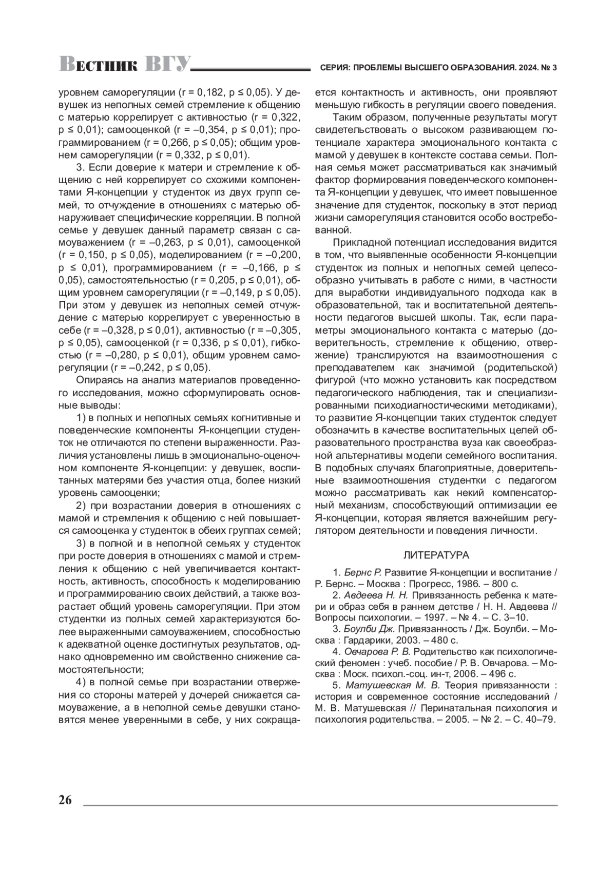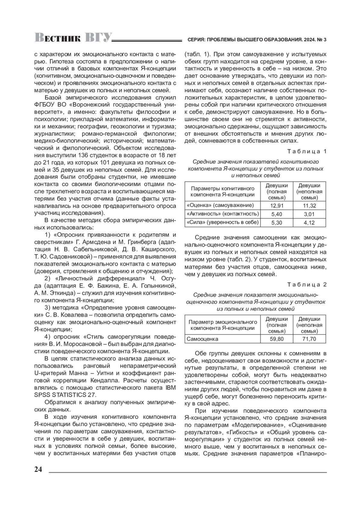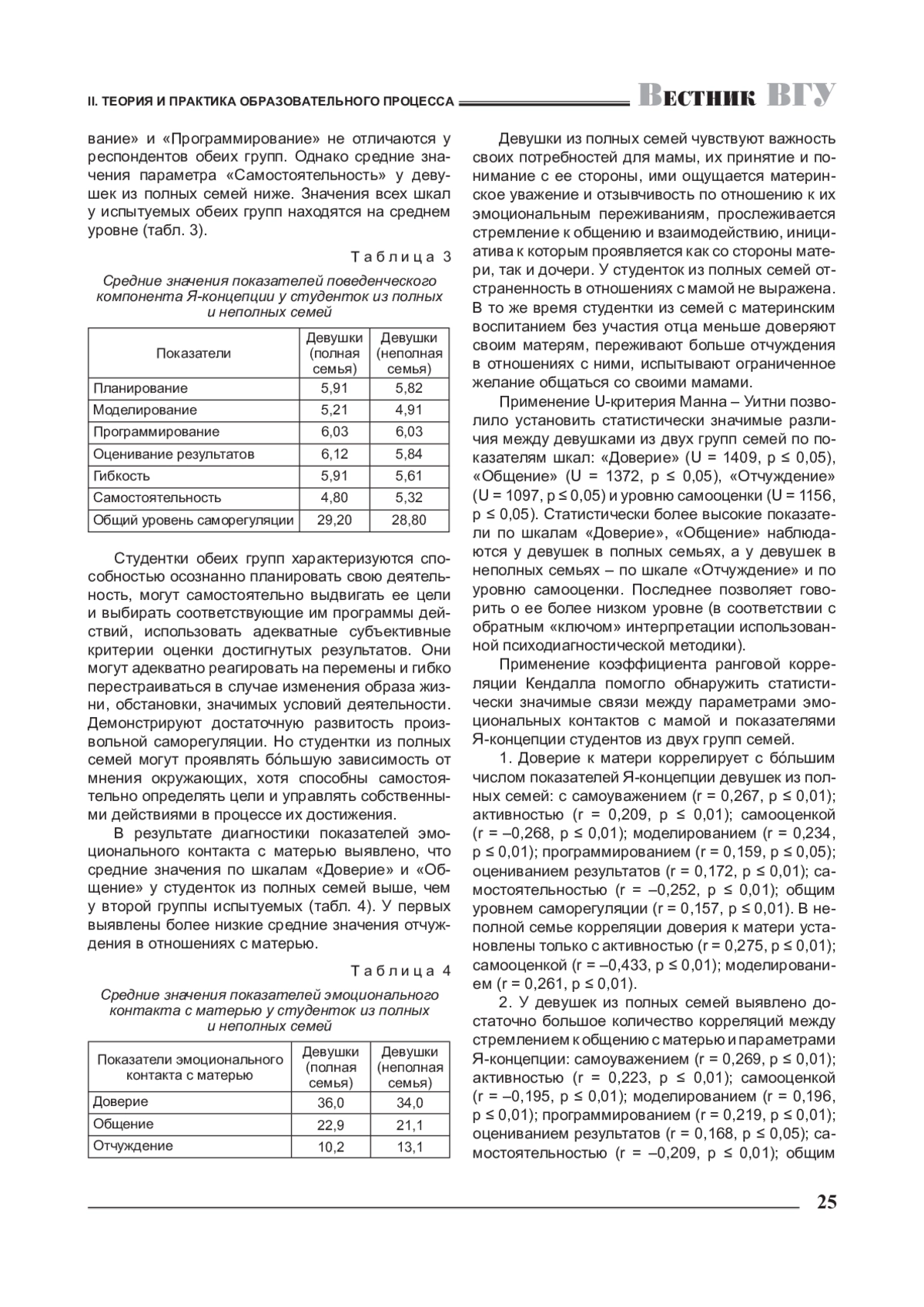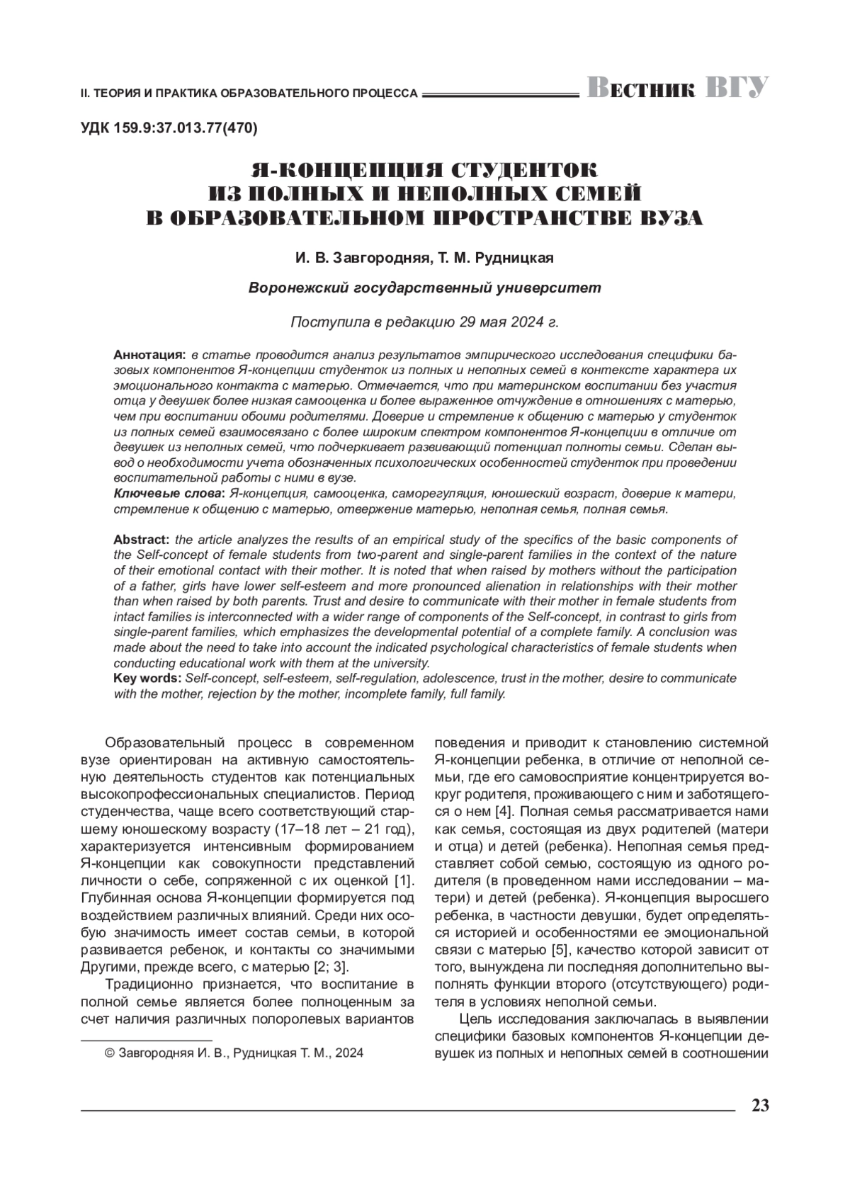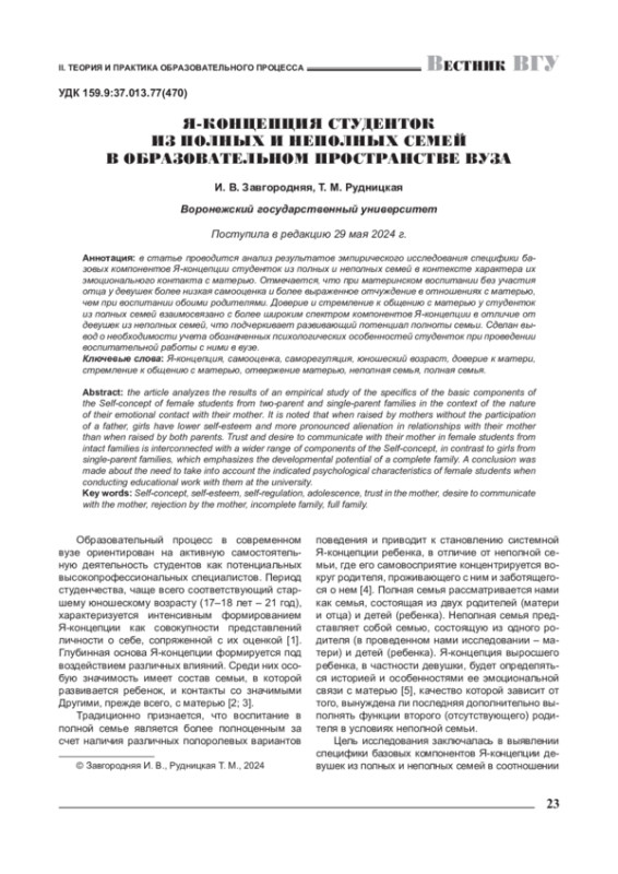 В статье проводится анализ результатов эмпирического исследования специфики базовых компонентов Я-концепции студенток из полных и неполных семей в контексте характера их эмоционального контакта с матерью. Отмечается, что при материнском воспитании без участия отца у девушек более низкая самооценка и более выраженное отчуждение в отношениях с матерью, чем при воспитании обоими родителями. Доверие и стремление к общению с матерью у студенток из полных семей взаимосвязано с более широким спектром компонентов Я-концепции в отличие от девушек из неполных семей, что подчеркивает развивающий потенциал полноты семьи. Сделан вывод о необходимости учета обозначенных психологических особенностей студенток при проведении воспитательной работы с ними в вузе.