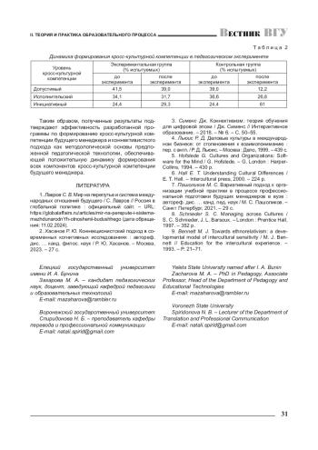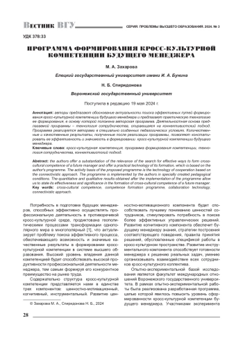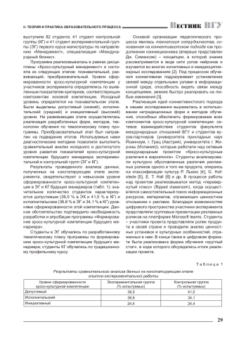 Авторы предлагают обоснование актуальности поиска эффективных путей формирования кросс-культурной компетенции будущего менеджера и предлагают практическую технологию ее формирования, в основу которой положена авторская программа. Деятельностная основа предлагаемой программы - технология сотрудничества, опирающаяся на коннективистский подход. Программа реализуется авторами в специально созданных педагогических условиях. Количественные и качественные результаты, полученные после реализации программы, позволяют констатировать ее эффективность и значимость в формировании кросс-культурной компетенции будущего менеджера.