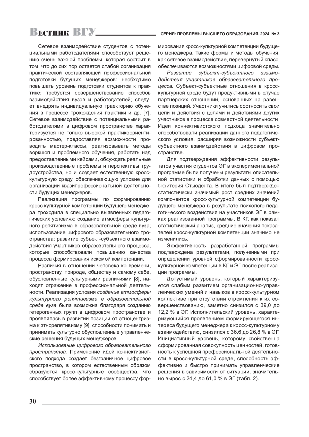 Сетевое взаимодействие студентов с потенциальными работодателями способствует решению очень важной проблемы, которая состоит в том, что до сих пор остается слабой организация практической составляющей профессиональной подготовки будущих менеджеров: необходимо повышать уровень подготовки студентов к практике; требуется совершенствование способов взаимодействия вузов и работодателей; следует внедрять индивидуальную траекторию обучения в процессе прохождения практики и др. [7]. Сетевое взаимодействие с потенциальными работодателями в цифровом пространстве характеризуется не только высокой практикоориентированностью, предоставляя возможности проводить мастер-классы, реализовывать методы воркшоп и проблемного обучения, работать над предоставленными кейсами, обсуждать реальные производственные проблемы и перспективы трудоустройства, но и создает естественную кросскультурную среду, обеспечивающую условие для организации квазипрофессиональной деятельности будущих менеджеров.