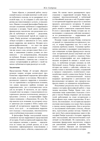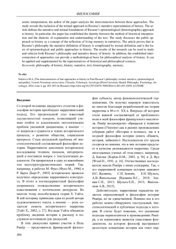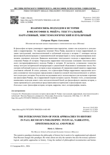 В философии истории доминирует нарративистская парадигма, однако она нуждается в дополнениях и корректировке. Эту парадигму изменяет Поль Рикёр, выделяя не только нарративный, но также текстуальный, эпистемологический и публичный подходы к истории. С помощью метода философской реконструкции и герменевтической интерпретации в статье проанализирована взаимосвязь указанных подходов. Выявлено включение текстуального подхода в нарративное представление Рикёра об истории. Определены нарративно-текстуальные основания эпистемологического (историографического) подхода Рикёра к истории. В частности, установлено тождество между методом исторической интерпретации и диалектикой объяснения и понимания текста. Рассмотрен публичный подход к истории в виде концепции об отражении живой памяти в нарративах участников событий. В статье доказано, что в философии Рикёра нарративное определение истории усложняется текстуальным определением и является основой эпистемологического и публичного подходов к истории. Результаты исследования могут использоваться для изучения и критики как философии Рикёра, так и нарративной теории истории в целом. Помимо этого, установленная взаимосвязь подходов может стать методологической базой для философского анализа истории, а также применяться и дополняться представителями исторических и философских наук.