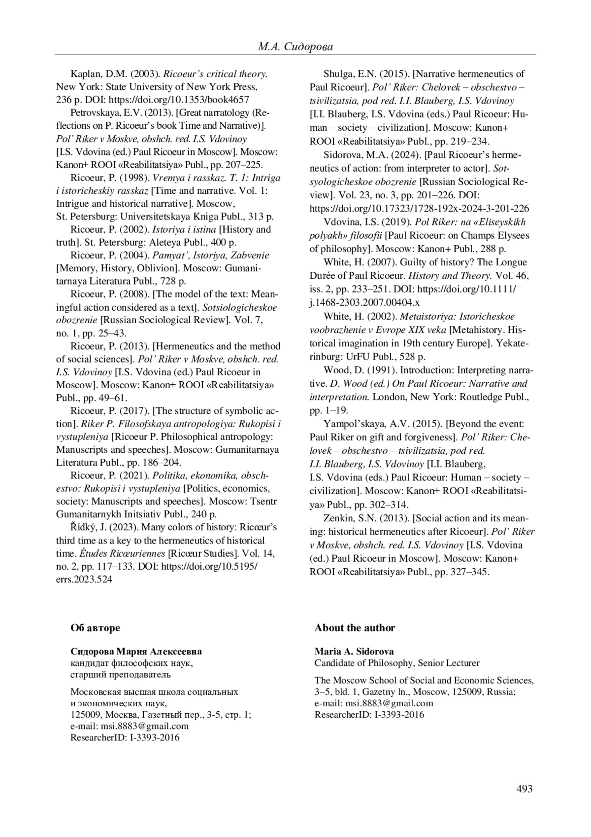 14. 	Сидорова М.А. Герменевтика действия Поля Рикёра: от интерпретатора к актору // Социологическое обозрение. 2024. Т. 23, № 3. С. 201-226. DOI: 10.17323/1728-192x-2024-3-201-226 EDN: AOYAGI