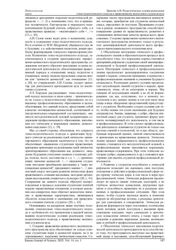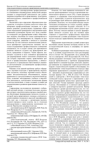 В статье обосновывается роль воспитания в условиях высшей школы в формировании поколения специалистов, для которых моральные нормы, нравственные ценности и профессионализм неразделимы. Раскрывается значение научных подходов к организации воспитательного процесса в вузе для обеспечения методологической обоснованности, целенаправленности и результативности воспитания студентов, обозначаются научные подходы к воспитанию в высшей школе (системный, аксиологический, синергетический, этико-педагогический и др.) и аргументируется необходимость определения педагогических условий реализации этико-педагогического подхода к нравственному воспитанию студентов вуза. На основании научных положений В. П. Бездухова, О. К. Поздняковой, А. И. Салова, Л. Л. Хоружей, И. М. Шадриной о сущности, содержании, назначении этико-педагогического подхода и особенностях его применения в высшей школе, выделены педагогические условия реализации этико-педагогического подхода к нравственному воспитанию студентов вуза: 1) создание нравственно-ценностного воспитательного пространства, 2) обеспечение интеграции этического и профессионального знания в образовательном процессе вуза, 3) развитие у студентов способности к этической рефлексии, 4) обеспечение этического наполнения педагогической деятельности преподавателя вуза, 5) вовлечение студентов в процессе как аудиторной, так и внеаудиторной деятельности в нравственные отношения.
