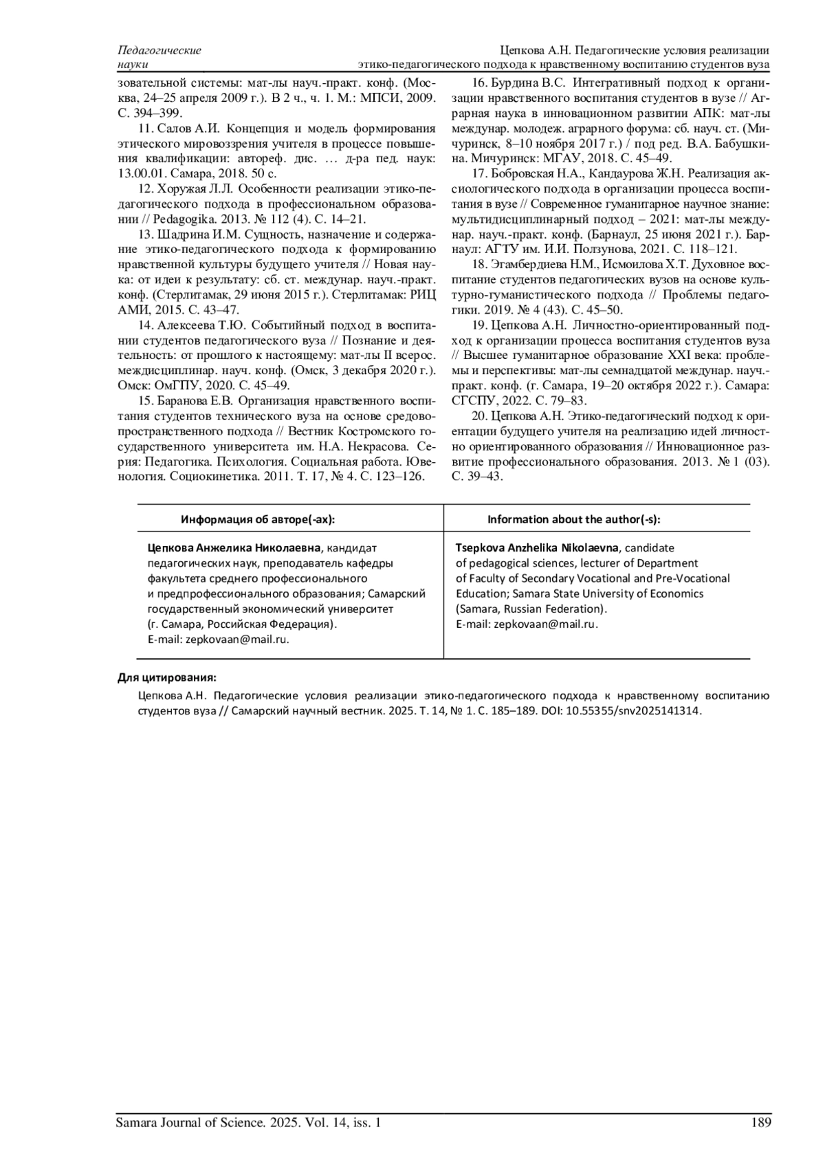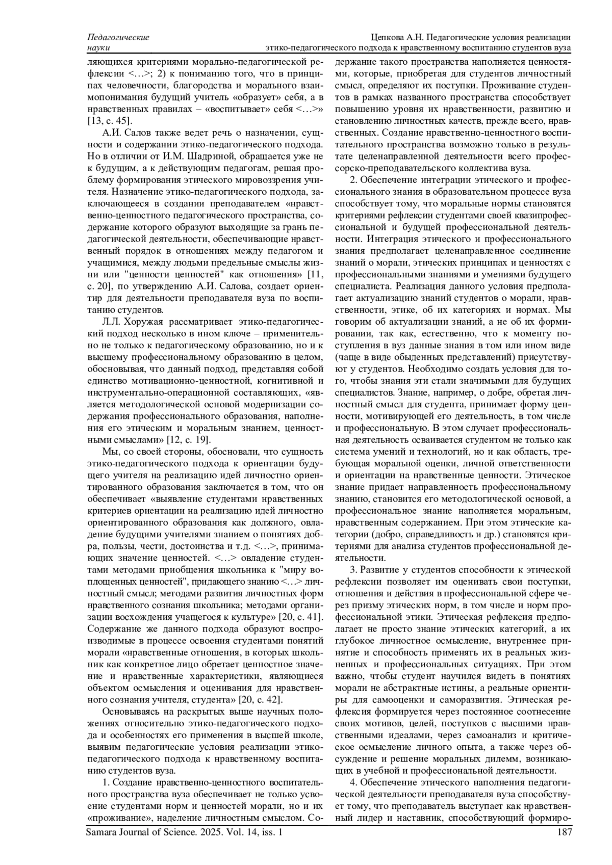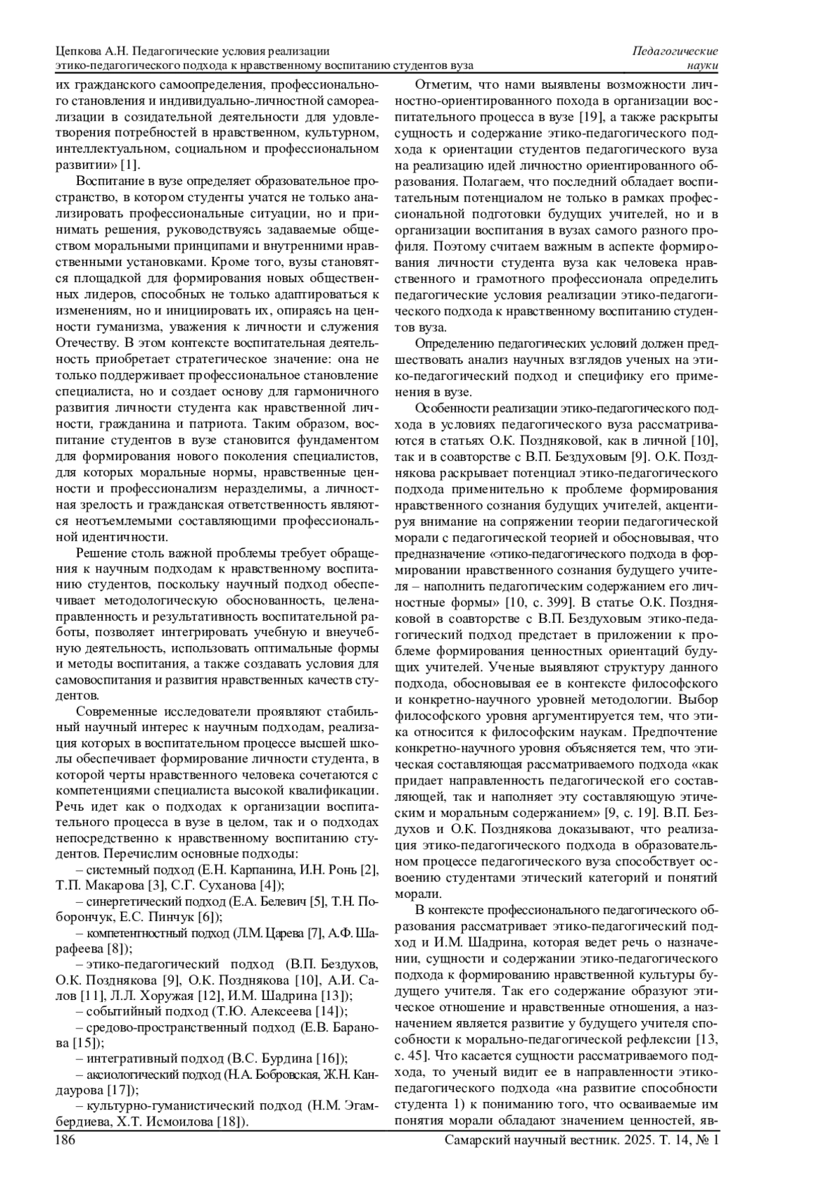20. 	Цепкова А.Н. Этико-педагогический подход к ориентации будущего учителя на реализацию идей личностно ориентированного образования // Инновационное развитие профессионального образования. 2013. № 1 (03). С. 39-43. EDN: TIPAUH