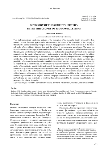 В статье представлен онтологический анализ концепции идентичности субъекта, которую в своем учении предлагает Эммануэль Левинас. Актуальность выбранной темы объясняется возросшим в последние десятилетия вниманием к категории идентичности субъекта в рамках гуманитарных исследований. Рассматривается левинасовская критика классической модели идентичности субъекта, в которой субъект осмысляется как тождественный самому себе. Обнаруживается связь этой модели идентичности с гегелевской трактовкой тотальности, понимаемой как снятие иного тождественным, а также с феноменологией Гуссерля. Отмечается существенный недостаток классической концепции идентичности субъекта, который состоит в ее неспособности утвердить окончательную тождественность субъекта самому себе, что приводит к подавлению инаковости в субъекте. Анализируется попытка Левинаса представить лицо Другого как выражение трансцендентного, подрывающее тотальность и открывающее возможность для построения альтернативной модели идентичности субъекта. Реконструируется левинасовская концепция идентичности как ответственности. Намечаются ее этические следствия. Констатируется, что модель идентичности субъекта, предложенная Левинасом, строится вокруг ответственности субъекта, понимаемой одновременно как ответственность субъекта перед Другим за самого себя и ответственность субъекта за Другого перед самим собой. В заключении на основании полученных результатов постулируется вывод о том, что левинасовская концепция способна обеспечить равновесие в субъекте между идентичностью и инаковостью при помощи идеи ответственности как центральной категории в построении модели идентичности субъекта. Демонстрируется, что модель идентичности субъекта, предложенная Левинасом, не только способствует решению проблем, создаваемых классической моделью, но и выступает полноценной альтернативой для этой модели.