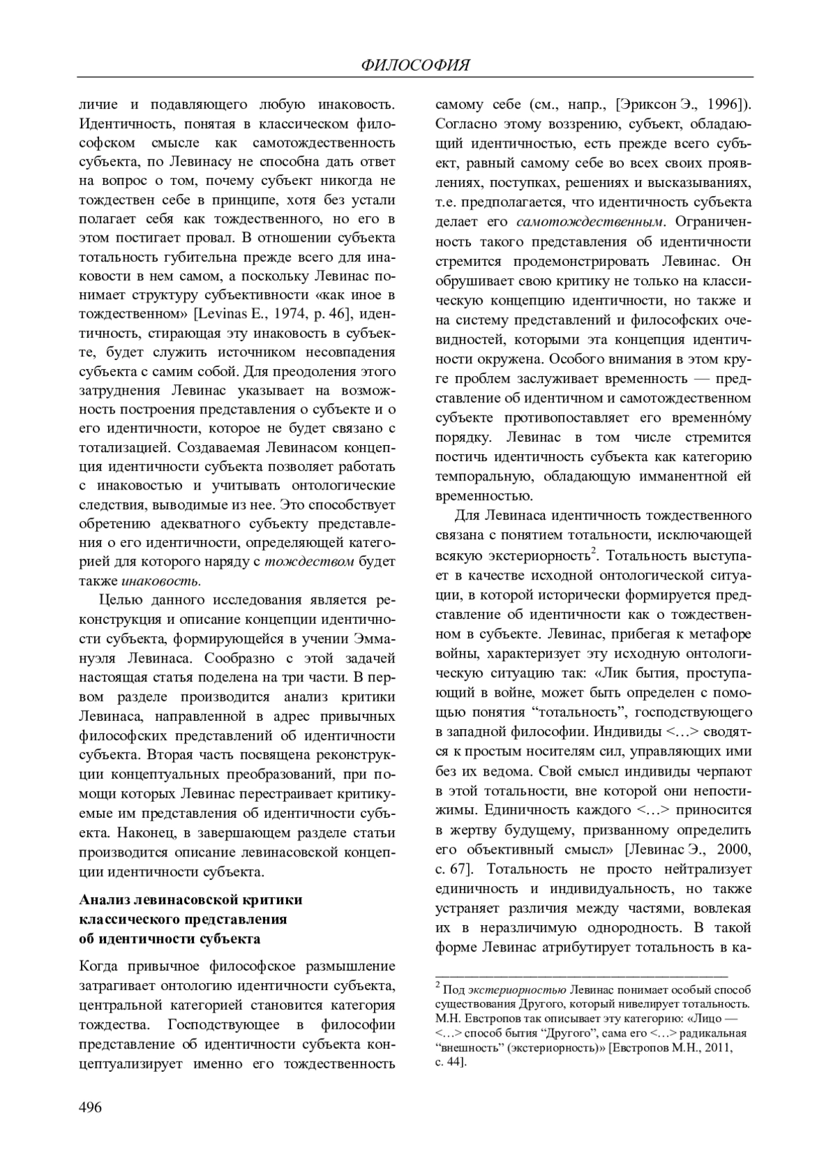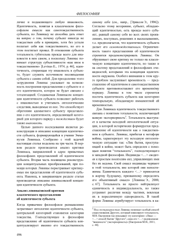 Особым вниманием сегодня пользуется проблематика идентичности субъекта. Чтобы правильно оценить преобразования, через которые тема идентичности прошла в философии ХХ в., необходимо осмыслить наследие Эммануэля Левинаса, а точнее — его вклад в развитие философской проблематики идентичности субъекта. На наш взгляд, этот вклад наиболее полным образом возможно исследовать только в онтологическом измерении идентичности субъекта. Левинас пересматривает сам способ существования такой категории, как идентичность, и этот изменившийся онтологический режим необходимо учитывать в философском анализе этой категории.