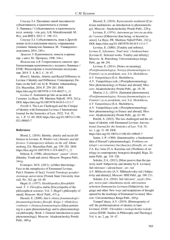 13. 	Blond L. Identity, Alterity and Racial Difference in Levinas // Identity and Difference: Contemporary Debates on the Self / ed. by R. Winkler. Johannesburg, ZA: Macmillan, 2016. P. 259-281. DOI: 10.1007/978-3-319-40427-1_11