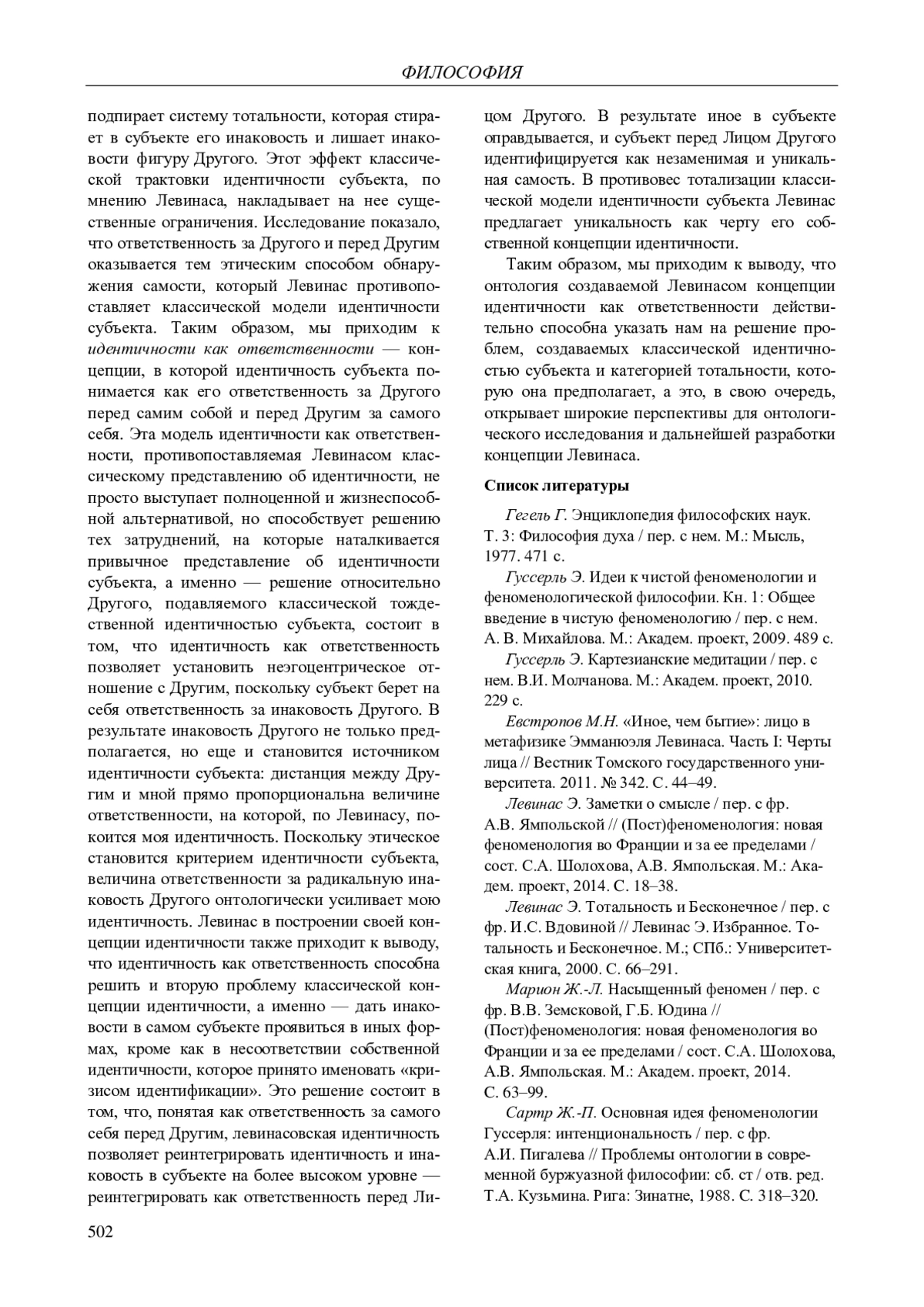 6. 	Левинас Э. Тотальность и Бесконечное / пер. с фр. И.С. Вдовиной // Левинас Э. Избранное. Тотальность и Бесконечное. М.; СПб.: Университетская книга, 2000. С. 66-291. EDN: TCFFHV