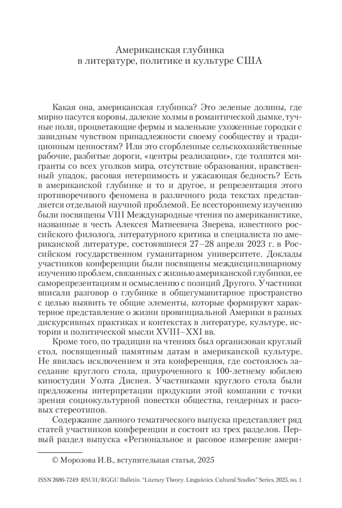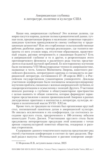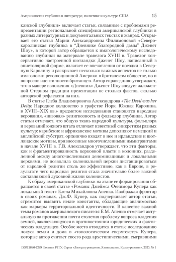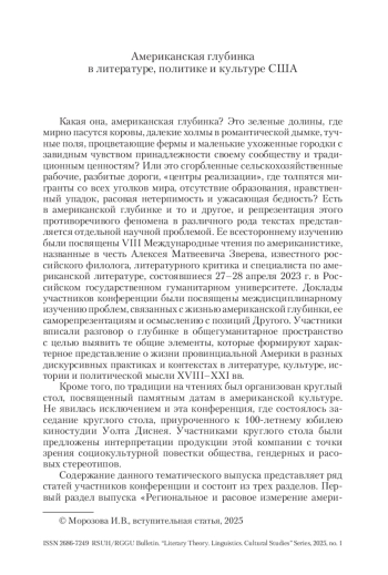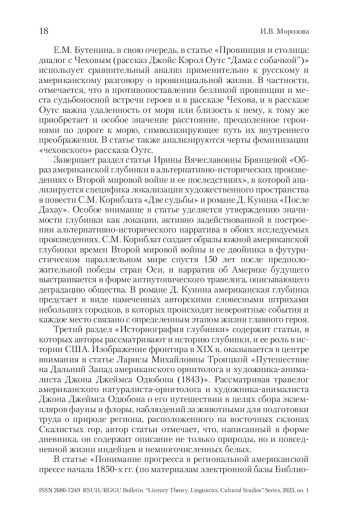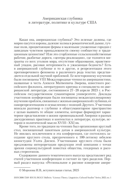 Американская готика представляет собой сложное культурное и литературное явление, обеспеченное региональной спецификой США. Под «зонтиком» термина помещаются две своеобразные традиции готической литературы – новоанглийская, в большей степени сфокусированная на погружении в глубины человеческой психики и тщательно фиксирующая различные рефлексии персонажей, и южная, обязанная своим появлением тяжелым переживаниям и размышлениям южан по поводу смерти мифологического прекрасного Юга в результате Гражданской войны. В силу специфической социокультурной жизни на Юге не было крупных урбанистических центров, сердцем Юга является глубинка, с характерной для нее укорененностью в традициях прошлого. Южная глубинка – скорее топос, обобщенное место разворачивания смыслов, связанных с уникальным южным опытом жизни, часто набор устойчивых фабульных формул, а также общих мотивов, проблем и сюжетов. В статье рассматриваются некоторые типические черты поэтики южной готики.