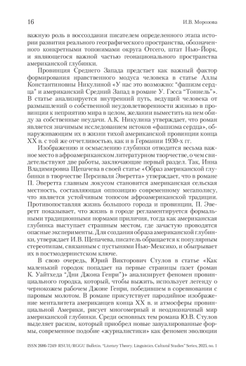 Для афроамериканской литературной традиции всегда было характерно противопоставление большого города и глубинки, индивидуума и общины, что восходит еще к коллективному сознанию афроамериканцев. В творчестве современного афроамериканского писателя Персиваля Эверетта американская глубинка играет если не первостепенную, то существенную роль, поскольку довольно часто местом действия своих романов писатель выбирает небольшие американские города и их округи. Примером такого произведения может служить роман «Американская пустыня» (American Desert, 2004). Действие романа начинается в Лос-Анджелесе, а затем переносится в южный малонаселенный штат Нью-Мексико, который знаменит своими безлюдными пустынями и отсутствием больших городов. Обращаясь к каноническим топосам афроамериканской литературы, Эверетт противопоставляет две локации, изображая особенности образа жизни героев, их обычаи и нравы, отношение к семейным ценностям, религии, медицине, государству и т. д. Жизнь в городе регламентируется традиционными нормами приличия, соблюдение которых носит формальный характер, тогда как американская глубинка выступает местом для проведения устрашающих и опасных экспериментов. Кроме того, для создания образа американской глубинки писатель обращается к популярным стереотипам, связанным с пустынями Нью-Мексико, и обыгрывает их в постмодернистском ключе.