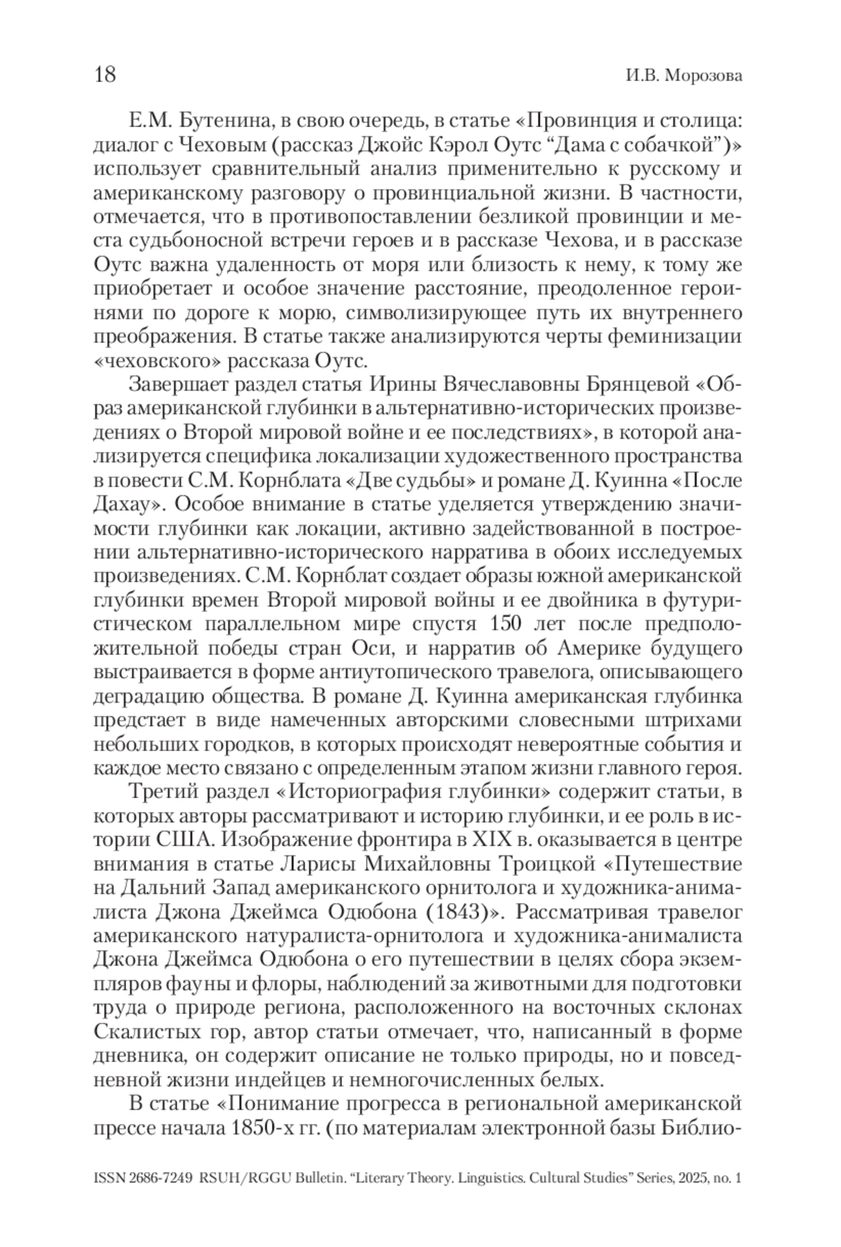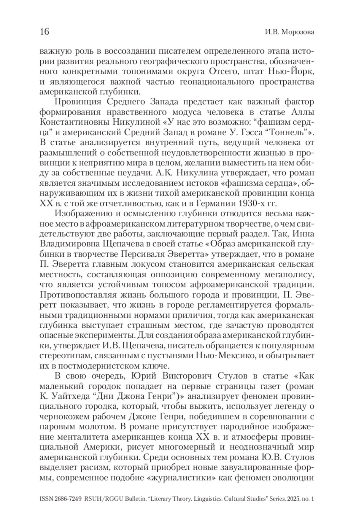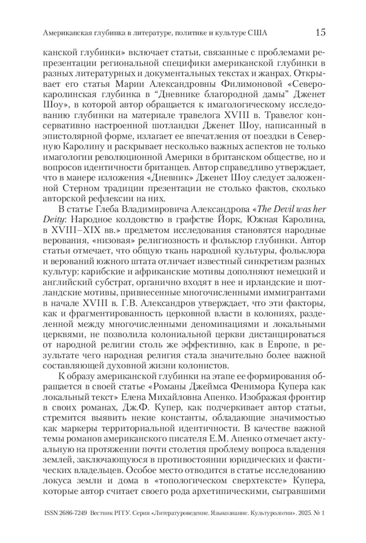 Большая часть произведений Дж. Ф. Купера может рассматриваться как своего рода «топологический сверхтекст», поскольку их место действия – округ Отсего, штат Нью-Йорк, во времена, когда именно там проходила граница между освоенными и еще «дикими» землями – знаменитый фронтир. Образ американской глубинки на этапе ее формирования реализуется в изображении определенного топоса, обладающего особыми характеристиками. Литературные описания последовательно вовлекаются в продуцирование знания об объекте реальности. Писатель стремится выявить некие константы, обладающие значимостью как маркеры территориальной идентичности. Во-первых, во всех повествованиях постоянно рассматривается вопрос владения землей. Описывая прошлое своей родной провинции, Купер представил одну из характерных черт организации жизни вдалеке от «центра», актуальную для глубинки в Штатах вообще вплоть до конца XIX в.: противостояние юридических и фактических владельцев. Во-вторых, Купер подробно исследует образносмысловой диапазон локуса дома, важный в любой культурной системе и особенно значимый для людей, пришедших на новое место. Земля и дом в «топологическом сверхтексте» Купера – это своего рода архетипические локусы, которые сыграли важную роль в воссоздании автором истории развития фронтира – реального географического пространства, обозначенного конкретными топонимами и являющегося важной частью геонационального пространства американской глубинки.