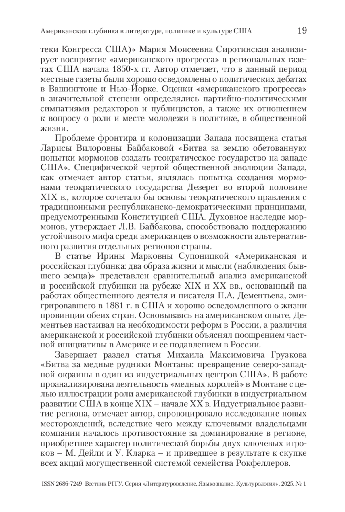 Статья представляет сравнительный анализ американской и российской глубинки на рубеже ХIХ и ХХ вв., основанный на работах общественного деятеля и писателя, помещика Тверской губернии П. А. Дементьева. Эмигрировав в 1881 г. в США, он жил в разных штатах и был хорошо знаком с провинцией обеих стран. В статьях, опубликованных под псевдонимом П. А. Тверской в российских журналах, главным образом в «Вестнике Европы», и книгах, Дементьев как бывший земец уделил особое внимание системе образования и местного самоуправления. Рассмотрев школьное дело в штатах Америки и в России, он пришел к неутешительным выводам о его состоянии в отечестве, где так и не был принят закон об обязательном начальном образовании. Столь же неблагоприятен взгляд на роль земства, ограниченного в полномочиях. Основываясь на американском опыте, Дементьев настаивал на необходимости реформ в этих областях, как и в других, в первую очередь аграрной, предлагая освободить крестьянство от гнета всевозможных платежей – причины бедности провинции и неграмотности ее населения. Различия американской и российской глубинки журналист объяснял поощрением частной инициативы в Америке и ее подавлением в России, призывая уничтожить бюрократические преграды на пути развития «общественной самодеятельности».
