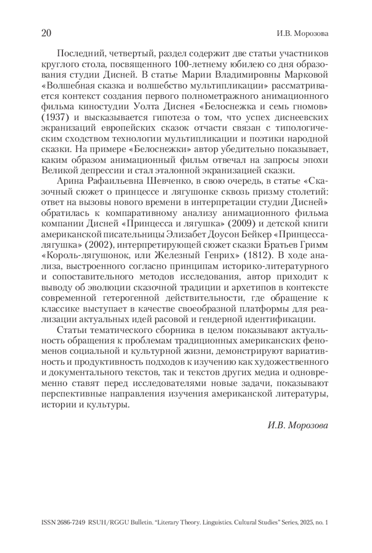 Статья посвящена диалогу со сказочной традицией, представленному в анимационном фильме компании Дисней «Принцесса и лягушка» (2009). В основе сценария – детская книга американской писательницы Элизабет Доусон Бейкер «Принцесса-лягушка» (2002), представляющая собой интерпретацию сюжета сказки Братьев Гримм «Король-лягушонок, или Железный Генрих» (1812). Помимо характеристики особенностей художественного взаимодействия претекстов и кинотекста, обращение к мультфильму «Принцесса и лягушка» также предоставляет возможность выявить специфику существенных модификаций в диснеевском каноне. Трансформация типичного образа принцессы; смещение акцента с ожидания «принца на белом коне» в роли спасителя на идею об осуществлении мечты о карьере и независимости; изображение синтеза французской, афроамериканской и «белой» американской культур – все это позволяет определить рассматриваемый нами материал как продукт нового времени, выступающий в качестве визуализации фундаментальных изменений в социуме и культуре. В ходе анализа, выстроенного согласно принципам историко-литературного и сопоставительного методов исследования, мы приходим к выводу об эволюции сказочной традиции и архетипов в контексте современной гетерогенной действительности, где обращение к классике выступает в качестве своеобразной платформы для реализации актуальных идей.