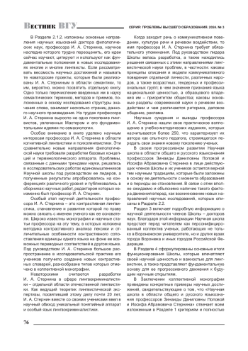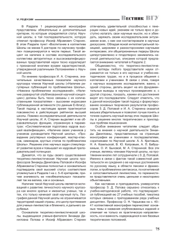 Общеизвестно, что теоретико-лингвистические взгляды любого представителя науки отражаются не только в его научных и учебно-методических трудах, но и в процессе общения с коллегами и учениками. В связи с этим, говоря о научных воззрениях исследователя, важно, с одной стороны, делать акцент на его фундаментальные выводы в научных произведениях и, с другой стороны, показать, какими его достижения видят его последователи. Следует отметить, что в данной монографии такой подход к формулированию основных творческих результатов профессоров З. Д. Поповой и И. А. Стернина оказался весьма убедительным и позволил лучше понять и точнее оценить научный вклад этих лидеров Школы в решение многих теоретических и прикладных проблем языкознания.