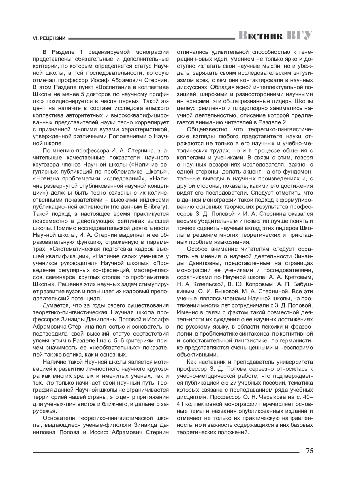 В рецензии на коллективную монографию анализируется информация, собранная и обобщенная научными редакторами данного издания М. А. Стерниной и А. В. Рудаковой, о становлении и этапах развития теоретико-лингвистической «Научной школы в области общего и русского языкознания профессоров Зинаиды Даниловны Поповой и Иосифа Абрамовича Стернина». В частности, речь идет о статусных критериях Научной школы, о научном наследии ее основателей и лидеров, о новейших достижениях действующих членов Научной школы и их последователей.