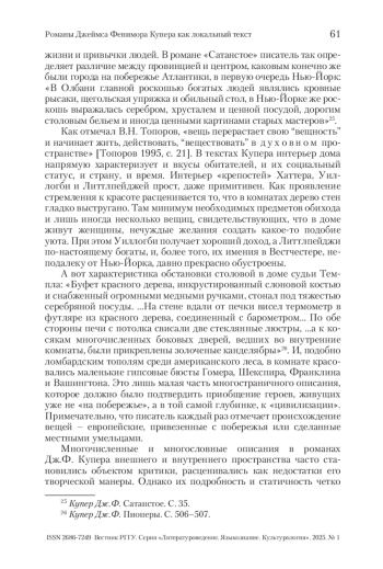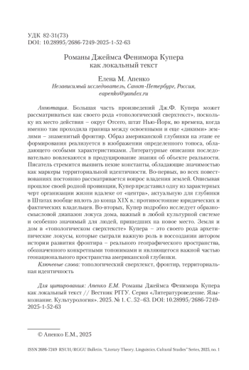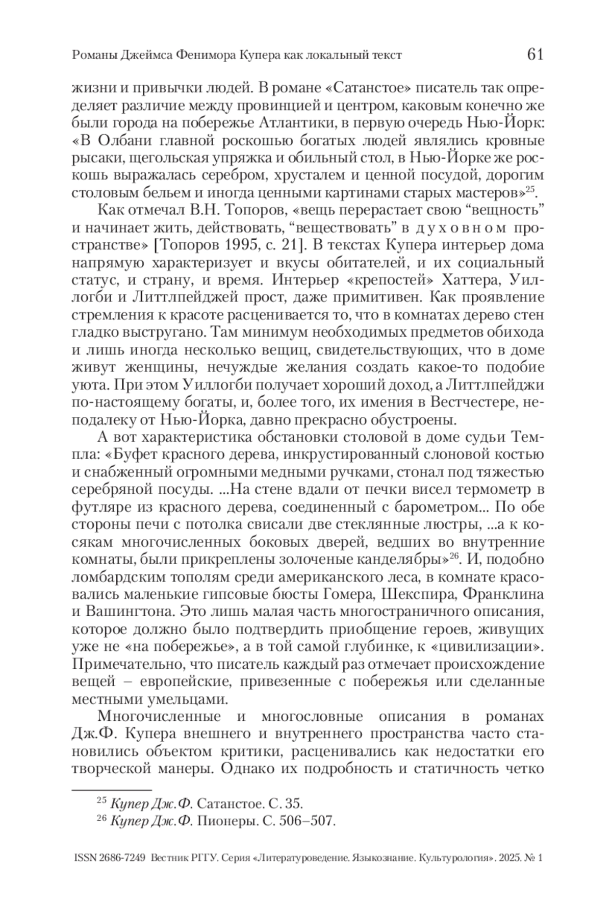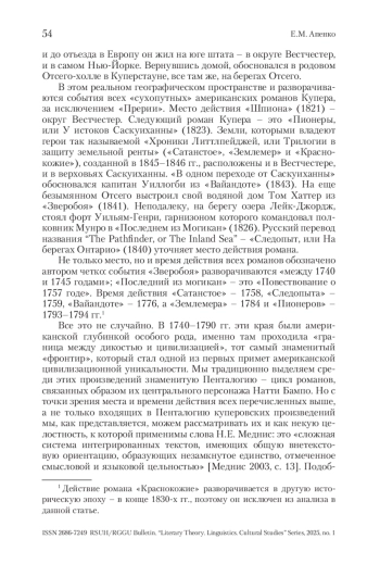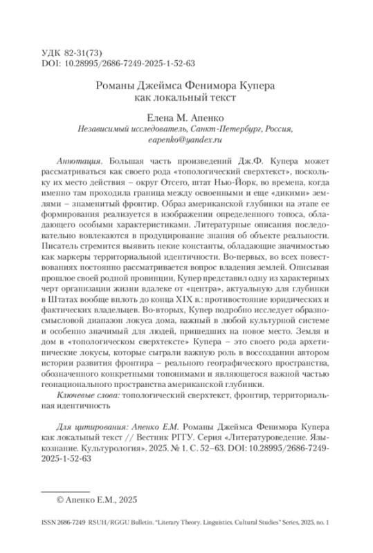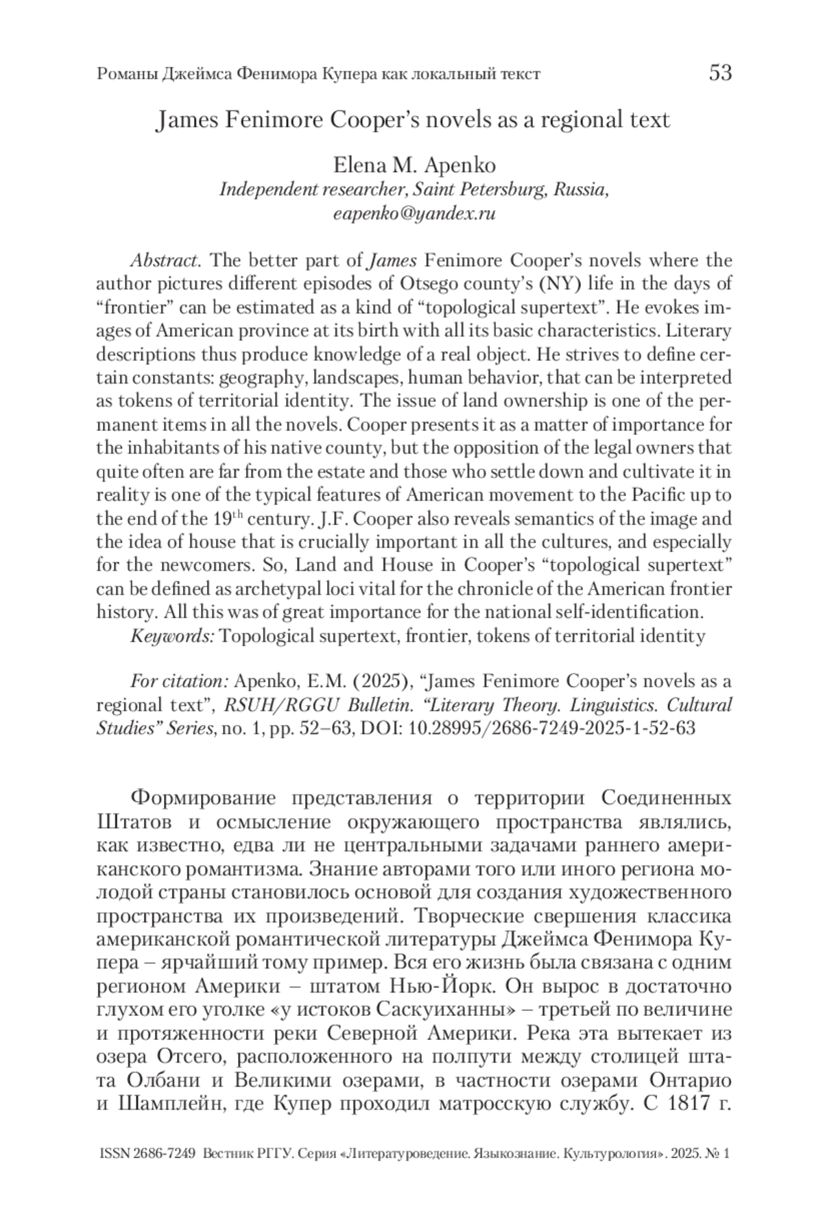 Большая часть произведений Дж. Ф. Купера может рассматриваться как своего рода «топологический сверхтекст», поскольку их место действия – округ Отсего, штат Нью-Йорк, во времена, когда именно там проходила граница между освоенными и еще «дикими» землями – знаменитый фронтир. Образ американской глубинки на этапе ее формирования реализуется в изображении определенного топоса, обладающего особыми характеристиками. Литературные описания последовательно вовлекаются в продуцирование знания об объекте реальности. Писатель стремится выявить некие константы, обладающие значимостью как маркеры территориальной идентичности. Во-первых, во всех повествованиях постоянно рассматривается вопрос владения землей. Описывая прошлое своей родной провинции, Купер представил одну из характерных черт организации жизни вдалеке от «центра», актуальную для глубинки в Штатах вообще вплоть до конца XIX в.: противостояние юридических и фактических владельцев. Во-вторых, Купер подробно исследует образносмысловой диапазон локуса дома, важный в любой культурной системе и особенно значимый для людей, пришедших на новое место. Земля и дом в «топологическом сверхтексте» Купера – это своего рода архетипические локусы, которые сыграли важную роль в воссоздании автором истории развития фронтира – реального географического пространства, обозначенного конкретными топонимами и являющегося важной частью геонационального пространства американской глубинки.
