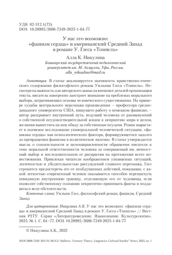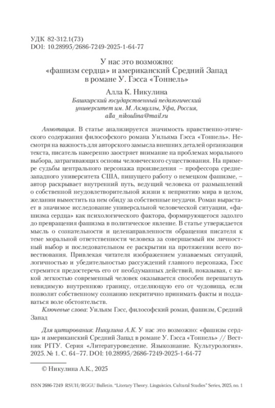 В статье анализируется значимость нравственно-этического содержания философского романа Уильяма Гэсса «Тоннель». Несмотря на важность для авторского замысла внешних деталей организации текста, писатель намеренно заостряет внимание на проблемах морального выбора, затрагивающих основы человеческого существования. На примере судьбы центрального персонажа произведения – профессора среднезападного университета США, пишущего работу о немецком фашизме, – автор раскрывает внутренний путь, ведущий человека от размышлений о собственной неудовлетворительной жизни к неприятию мира в целом, желании выместить на нем обиду за собственные неудачи. Роман вырастает в значимое исследование универсальной человеческой ситуации, «фашизма сердца» как психологического фактора, формирующегося задолго до превращения фашизма в политическое явление. В статье утверждается мысль о сознательности и целенаправленности обращения писателя к теме моральной ответственности человека за совершаемый им личностный выбор и последовательном ее раскрытии на протяжении всего повествования. Привлекая читателя изображением узнаваемых ситуаций, логичностью и убедительностью рассуждений главного персонажа, Гэсс стремится предостеречь его от необдуманных действий, показывая, с какой легкостью современный человек оказывается способен перешагнуть невидимую внутреннюю границу, отделяющую его от чудовища, если позволит собственному сознанию некритично принимать факты и поддаваться воле обстоятельств.