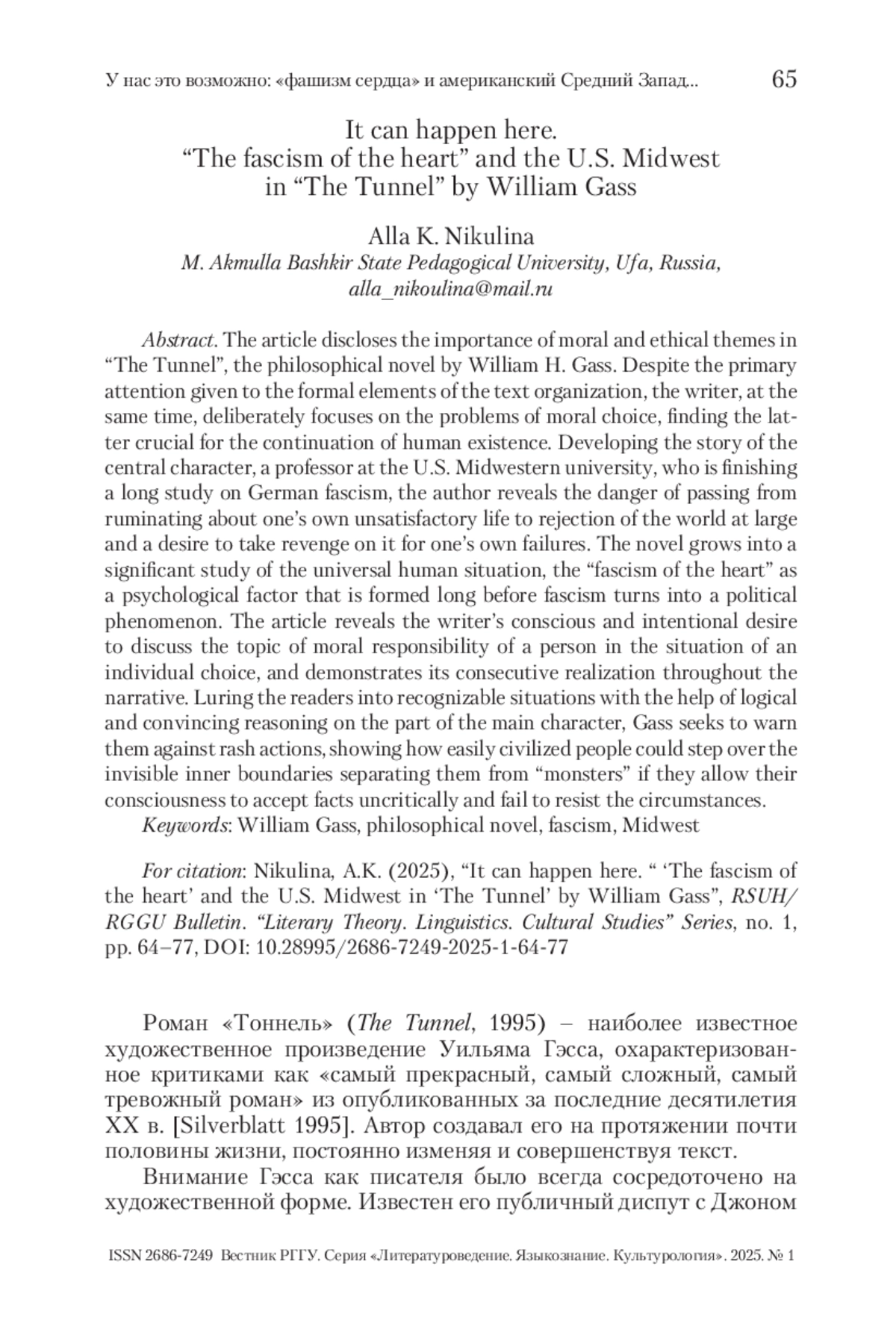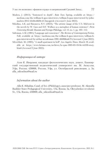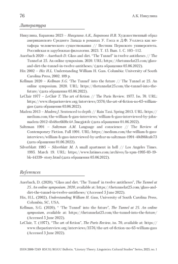 1. Никулина, Баранова 2023 - Никулина А.К., Баранова Н.В. Художественный образ американского Среднего Запада в романах У. Гэсса и Д.Ф. Уоллеса как метафора человеческого существования // Вестник Пермского университета. Российская и зарубежная филология. 2023. Т. 15. Вып. 1. С. 103-112.