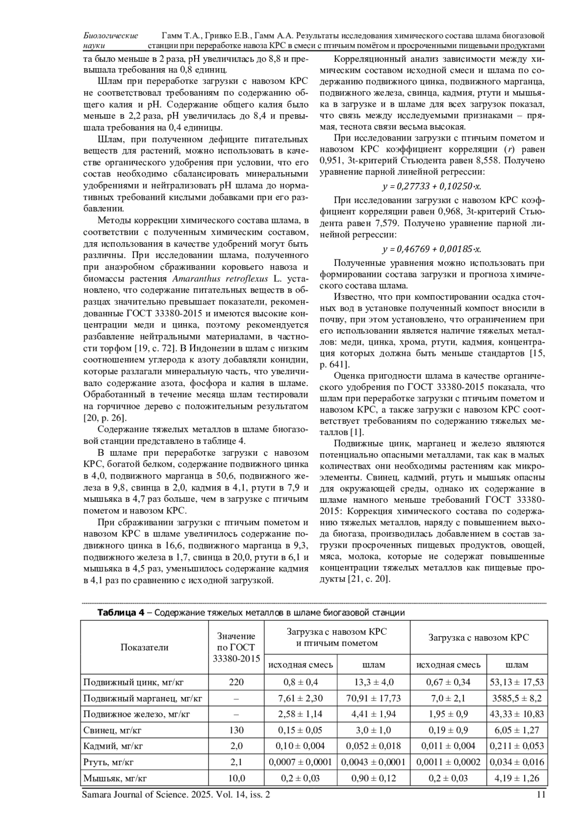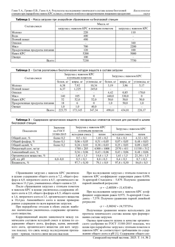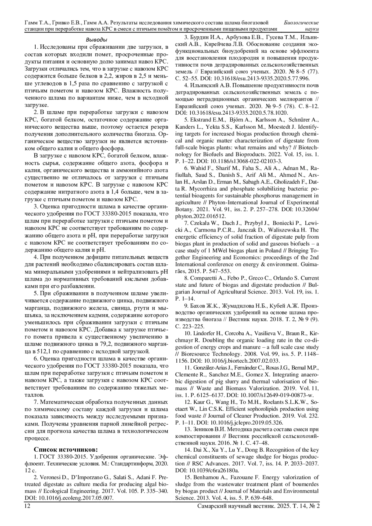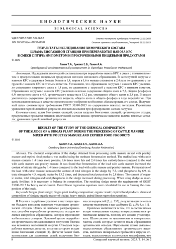 Исследовали химический состав шлама при переработке навоза КРС в смеси с птичьим пометом и просроченными пищевыми продуктами методом метанового сбраживания. В исследуемой загрузке с навозом КРС содержится больше белков в 1,4, жиров в 1,6 и меньше углеводов в 2,4 раза по сравнению с загрузкой с навозом КРС и птичьим пометом. Установили, что сбраживание загрузки с навозом КРС увеличило содержание нитратного азота в 1,4 раза, по сравнению с загрузкой с навозом КРС и птичьим пометом. Сбраживании загрузки с навозом КРС увеличило в шламе содержание общего азота в 7,2, общего фосфора в 6,9, нитратного азота в 4,5, органического вещества в 13,2 раз, уменьшило общего калия в 2,8 раз. В шламе увеличилось содержание органических веществ, общего азота и общего фосфора в ходе переработки. При использовании шлама в качестве органического удобрения необходимо сбалансировать его состав. Полученный шлам соответствует требованиям ГОСТ 33380-2015 по содержанию тяжелых металлов. Рассчитаны уравнения парной линейной регрессии для использования при формировании состава загрузок.