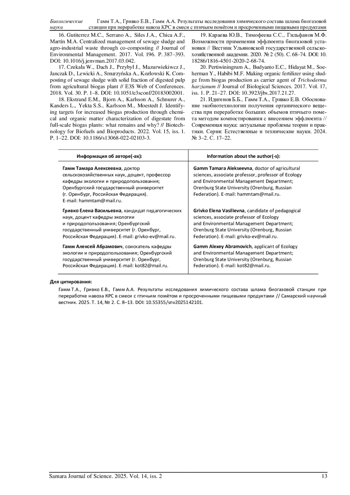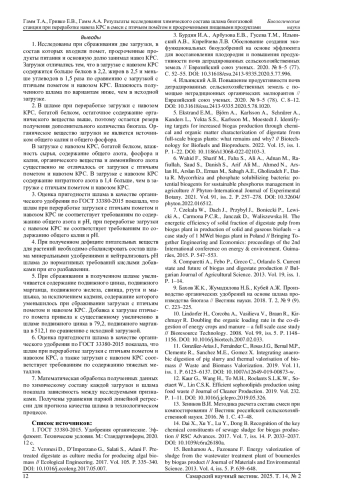 5. Ekstrand E.M., Björn A., Karlsson A., Schnürer A., Kanders L., Yekta S.S., Karlsson M., Moestedt J. Identifying targets for increased biogas production through chemical and organic matter characterization of digestate from full-scale biogas plants: what remains and why? // Biotechnology for Biofuels and Bioproducts. 2022. Vol. 15, iss. 1. P. 1-22. DOI: 10.1186/s13068-022-02103-3 EDN: BOMRVQ