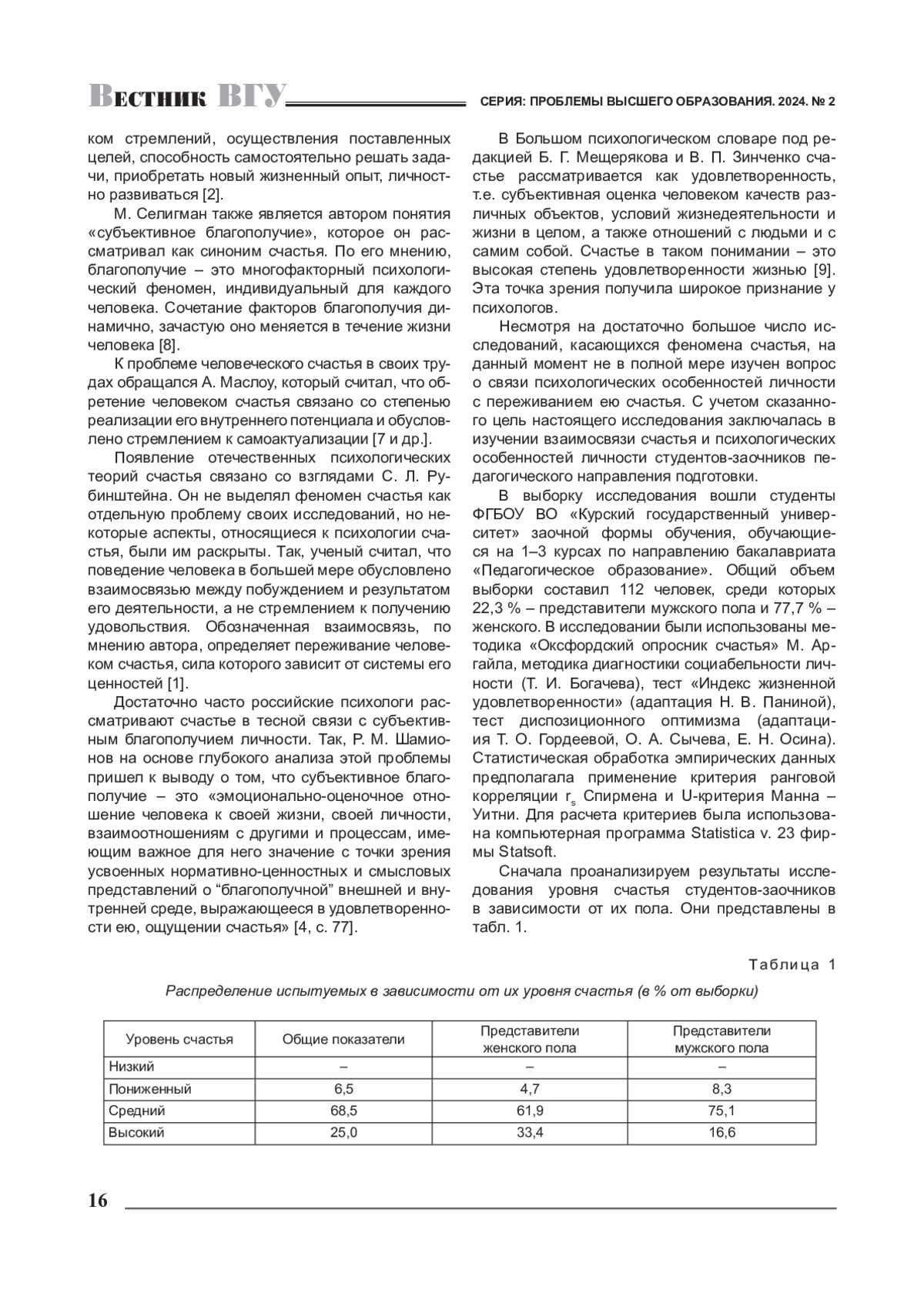 К проблеме человеческого счастья в своих трудах обращался А. Маслоу, который считал, что обретение человеком счастья связано со степенью реализации его внутреннего потенциала и обусловлено стремлением к самоактуализации [7 и др.]. Появление отечественных психологических теорий счастья связано со взглядами С. Л. Рубинштейна. Он не выделял феномен счастья как отдельную проблему своих исследований, но некоторые аспекты, относящиеся к психологии счастья, были им раскрыты. Так, ученый считал, что поведение человека в большей мере обусловлено взаимосвязью между побуждением и результатом его деятельности, а не стремлением к получению удовольствия. Обозначенная взаимосвязь, по мнению автора, определяет переживание человеком счастья, сила которого зависит от системы его ценностей [1].