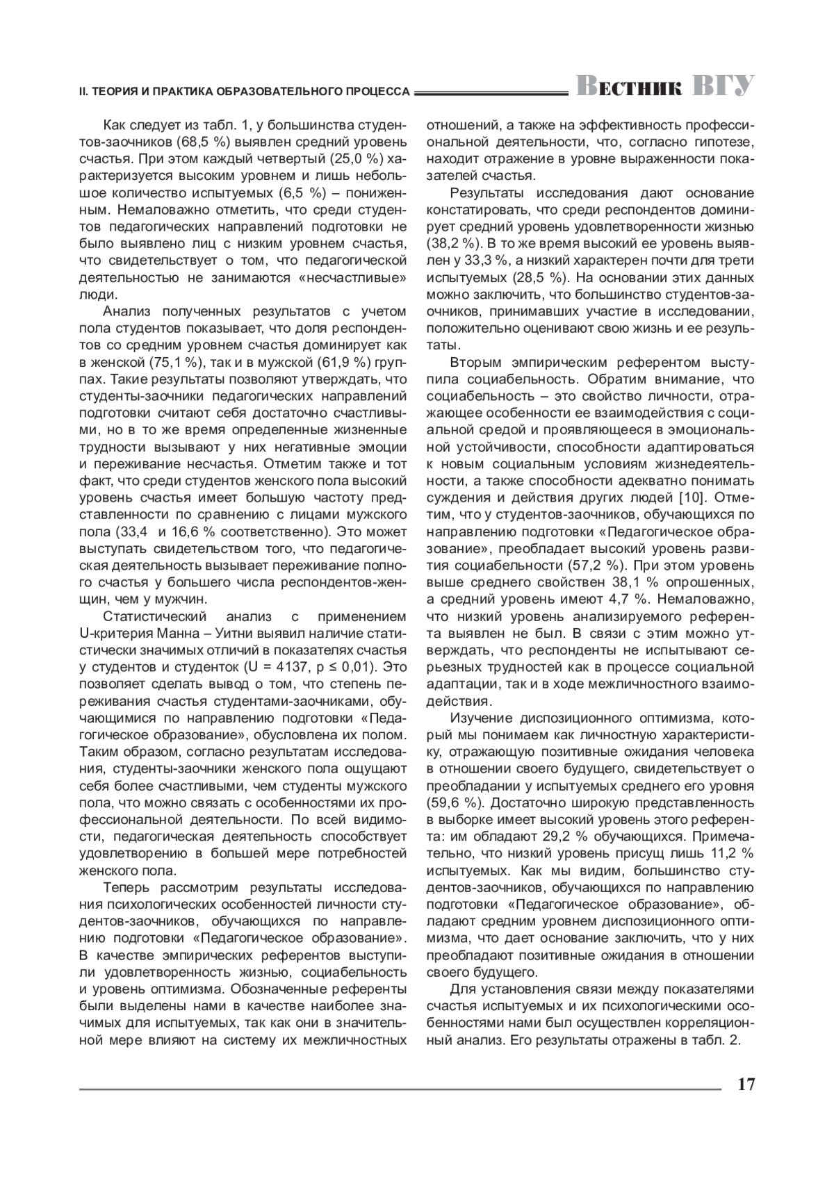 В статье представлены психологические основы изучения феномена счастья, проанализированы различные подходы в определении его содержания и структуры. Изложены результаты эмпирического исследования взаимосвязи счастья и психологических особенностей личности студентов-заочников педагогических направлений подготовки. Установлено, что переживание счастья у них положительно коррелирует с показателями их удовлетворенности жизнью, социабельности и диспозиционного оптимизма.