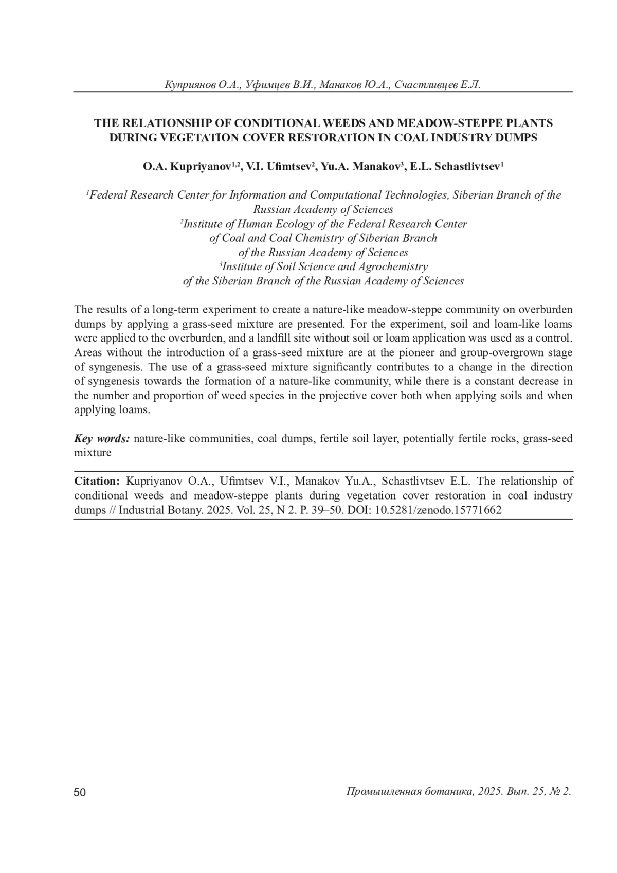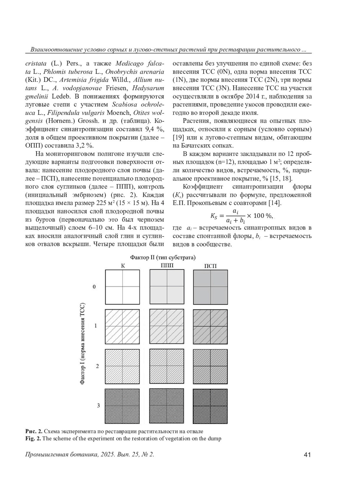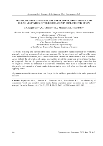 Приведены результаты многолетнего эксперимента по созданию природоподобного лугово-степного сообщества на отвалах вскрышной породы путем внесения травяно-семенной смеси. Для эксперимента на вскрышу наносилась почва и лесовидные суглинки, контролем выступил участок отвала без внесения почв или суглинков. Участки без внесения травяно-семенной смеси находятся на пионерной и группово-зарослевой стадии сингенеза. Применение травяно-семенной смеси в значительной мере способствует изменению направленности сингенеза в сторону образования природоподобного сообщества, при этом происходит постоянное снижение количества и доли сорных видов в проективном покрытии как при внесении почв, так и при внесении суглинков.