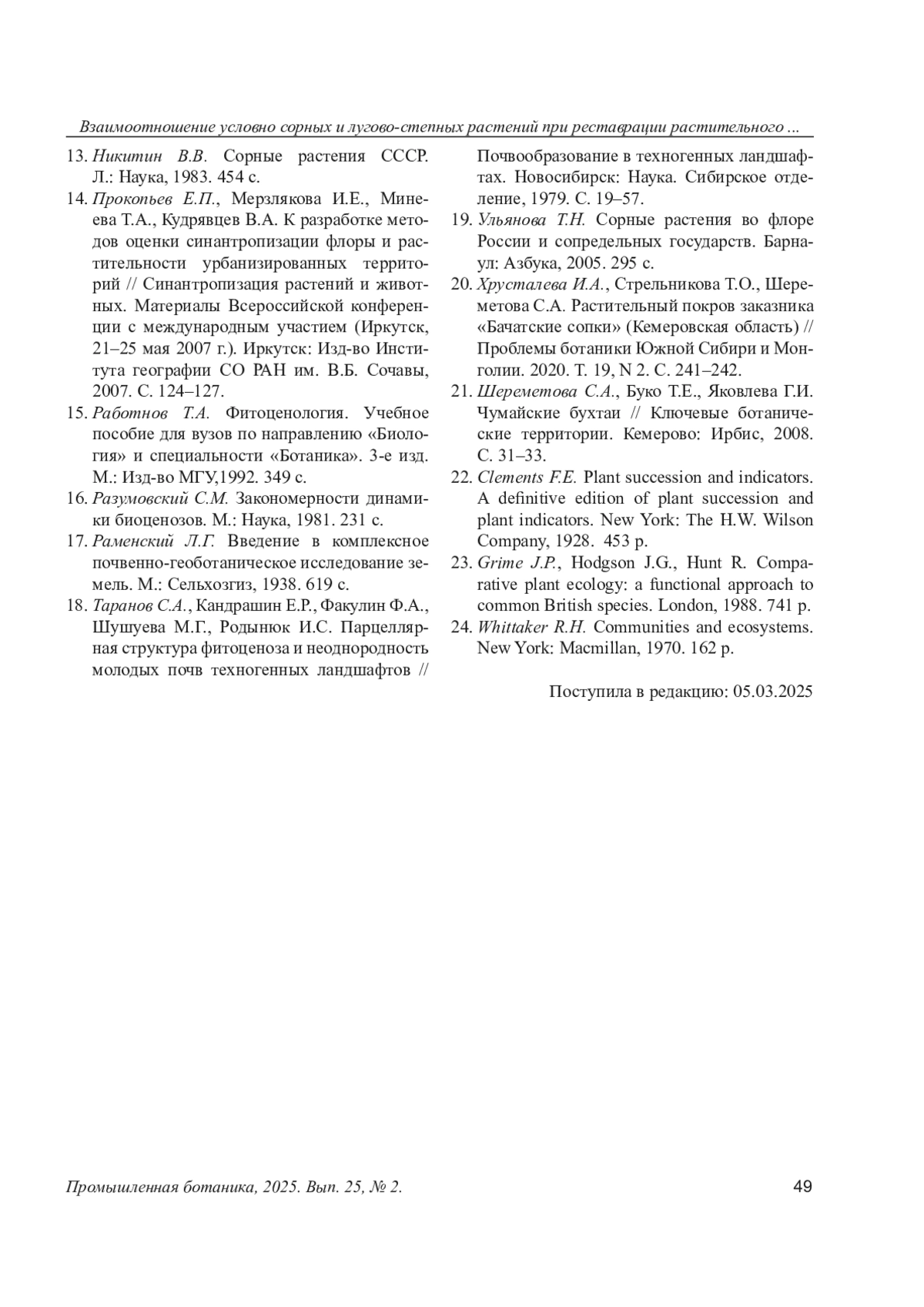 6. Куприянов А.Н., Марсакова Ю.В. Начальные этапы формирования растительного покрова на техногенных экотопах Кузбасса // Сибирский экологический журнал. 2008. Т. 15, N 2. С. 255-261.
