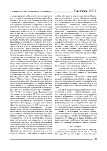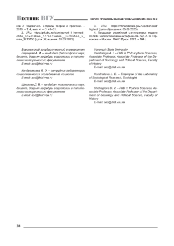 1. Дьячин А. С. Изменения в системе подготовки педагогических кадров в СССР в 50-х - начале 60-х годов ХХ века / А. С. Дьячин, А. Б. Кисельников // Педагогика. Вопросы теории и практики. - 2019. - Т. 4, вып. 4. - С. 47-51. EDN: XEQQGC 2. URL: https://pikabu. ru/story/govoril_li_kennedi_chto_sovetskoe_obrazovanie_luchshee_v_mire_9213758 (дата обращения: 05.09.2023). 3. URL: https://minobrnauki. gov. ru/action/stat/highed/(дата обращения: 05.09.2023). 4. Ландшафт российской магистратуры: модели DEANS: коллективная монография / отв. ред. А. В. Гармонова. - Москва: МАКС Пресс, 2023. - 164 с.