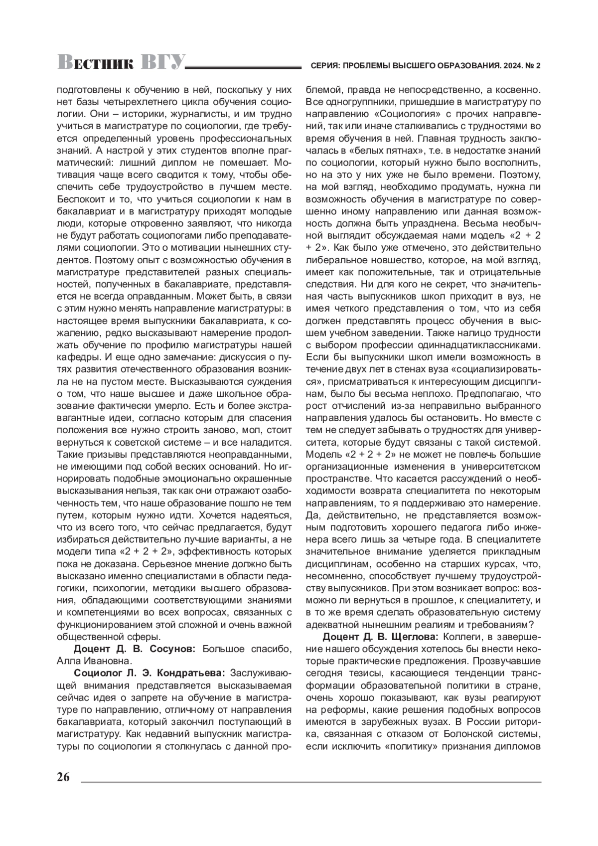 В феврале 2023 г. кафедрой социологии и политологии исторического факультета Воронежского государственного университета был проведен круглый стол, посвященный трансформации системы высшего образования в Российской Федерации. Был затронут ряд важных проблем, связанных с нынешним состоянием системы высшего образования и возможными результатами ее реформирования