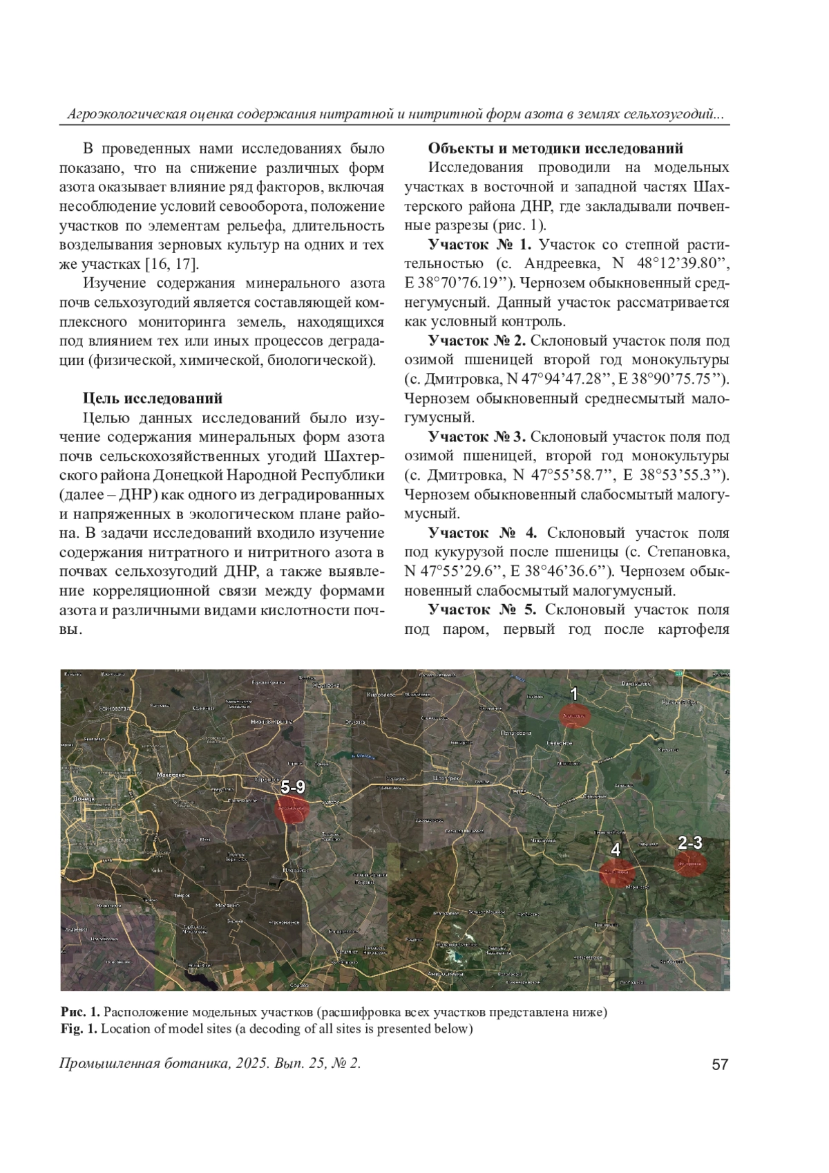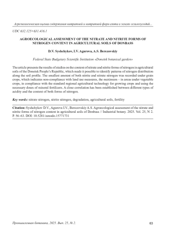 16. Сыщиков Д.В., Агурова И.В. Содержание минерального азота в деградированных почвах сельскохозяйственных угодий Шахтерского района Донецкой Народной Республики // Промышленная ботаника. 2023. Вып. 23, N 2. С. 61-66.
