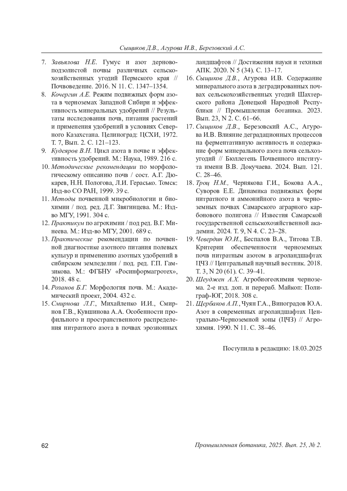 17. Сыщиков Д.В., Березовский А.С., Агурова И.В. Влияние деградационных процессов на ферментативную активность и содержание форм минерального азота почв сельхозугодий // Бюллетень Почвенного института имени В.В. Докучаева. 2024. Вып. 121. С. 28-46.