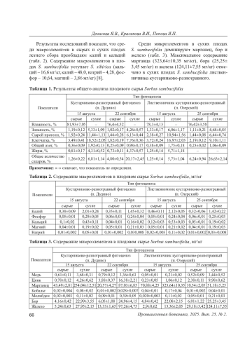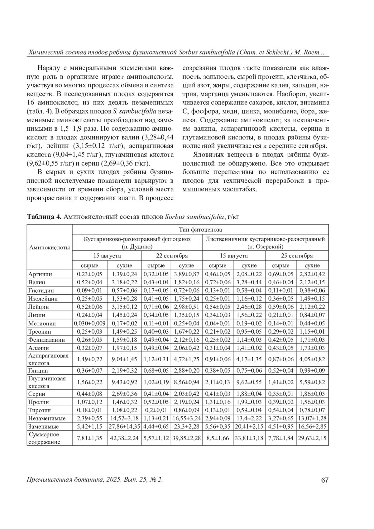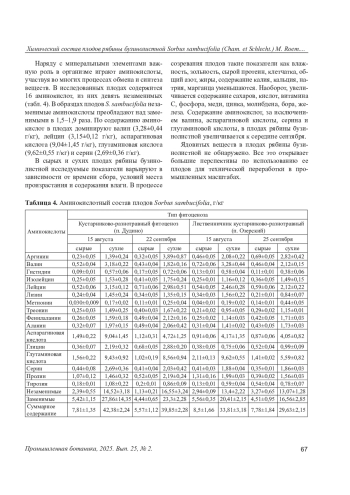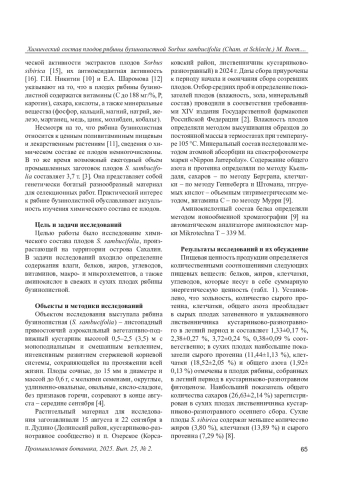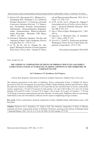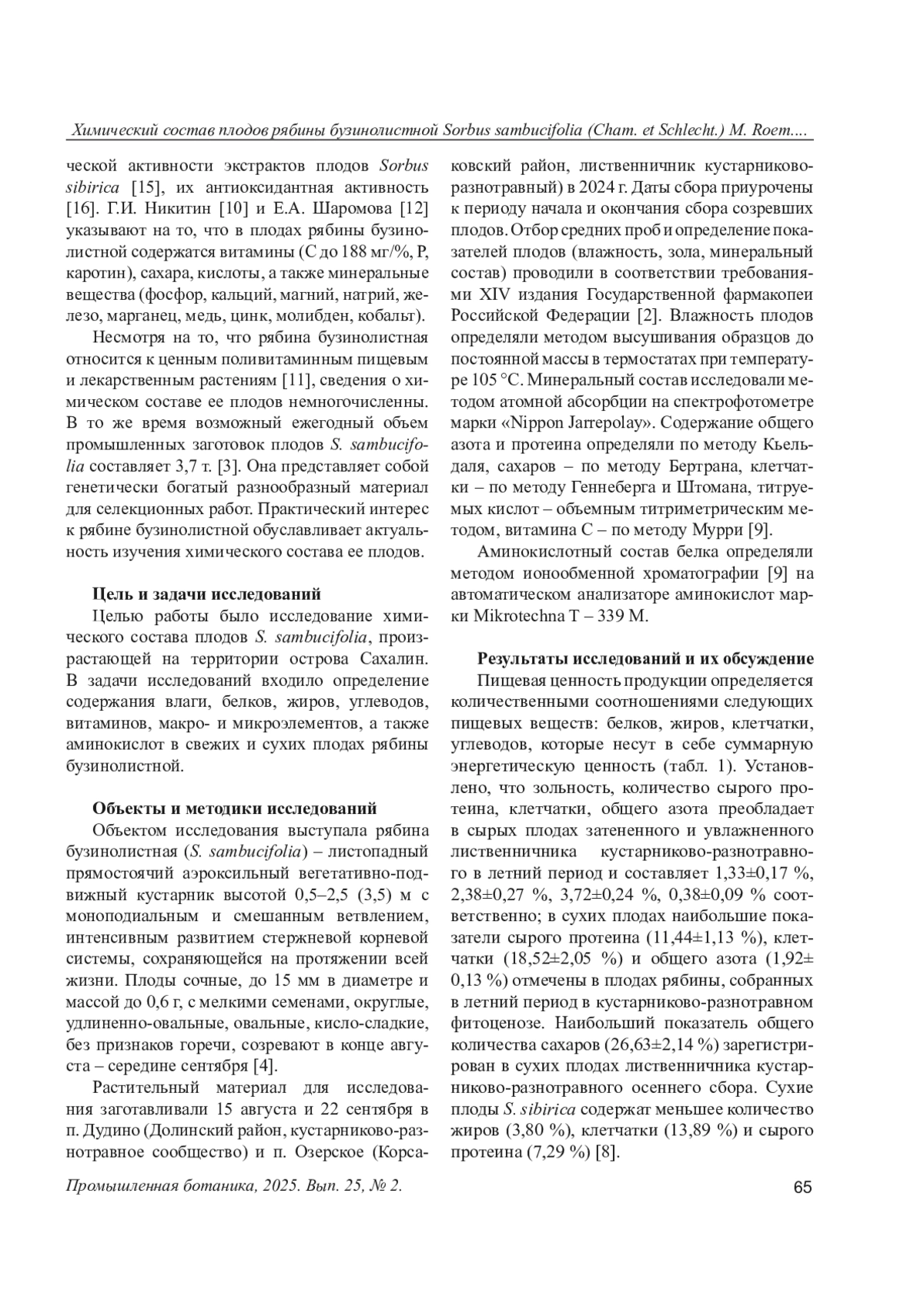 Исследован химический состав плодов рябины бузинолистной Sorbus sambucifolia (Cham. et Schlecht.) M. Roem. урожая 2024 г., произрастающей в п. Дудино (Долинский район) и п. Озерское (Корсаковский район) на острове Сахалин. Установлено, что в сырых и сухих плодах Sorbus sambucifolia содержится соответственно в процентах 1,79 и 8,74 сырого протеина, 2,81 и 13,09 клетчатки, 0,31 и 1,43 общего азота, 0,93 и 0,93 жиров, 3,39 и 4,79 сахаров, 3,64 кислот, 36,18 мг/% витамина С, 17,30 и 76,38 мг/кг каротина; макроэлементы и микроэлементы; 16 аминокислот. Плоды рябины бузинолистной являются перспективным поливитаминным источником для изготовления пищевой продукции в России, для экспорта в ближние зарубежные страны.