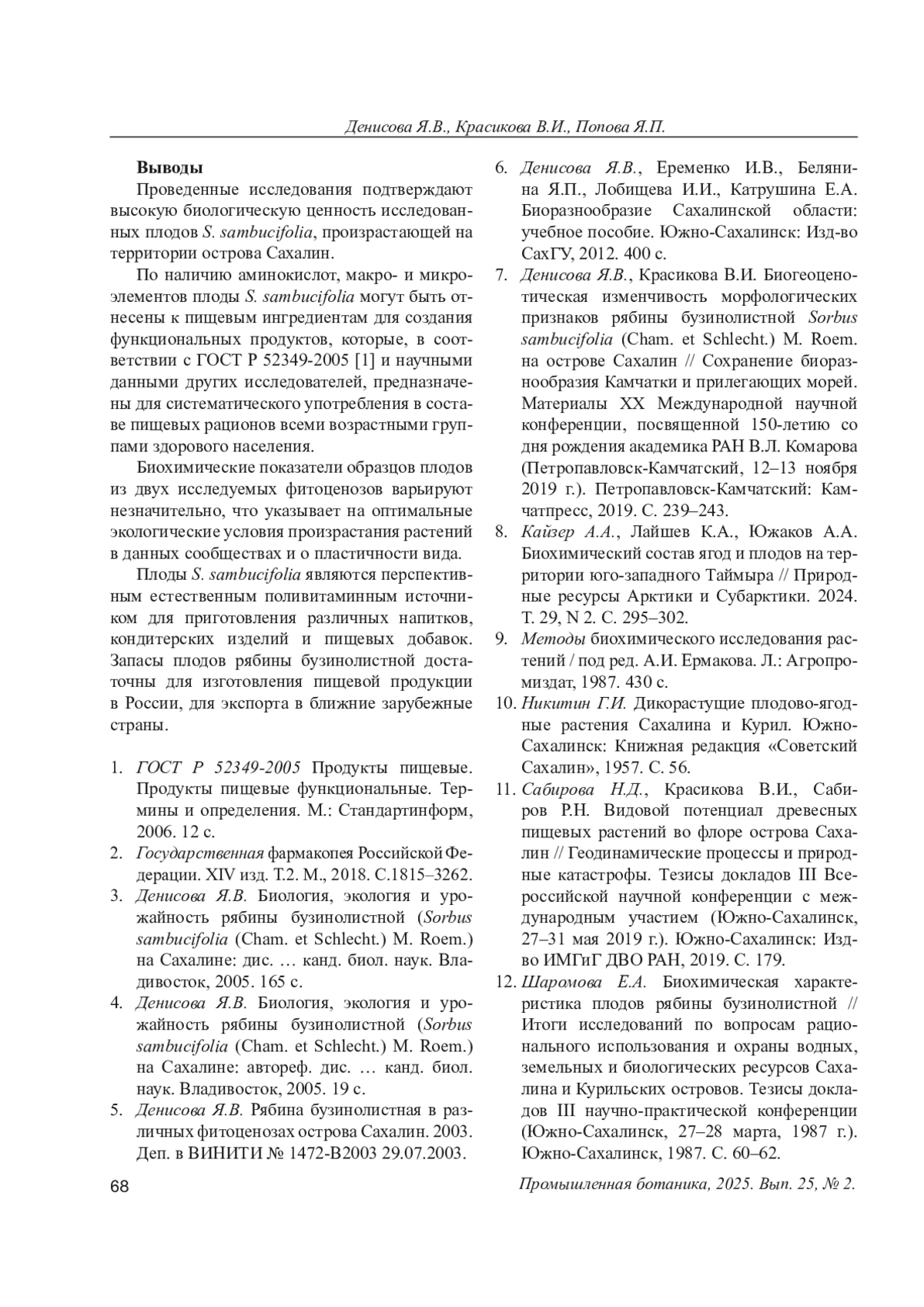 7. 	Денисова Я.В., Красикова В.И. Биогеоценотическая изменчивость морфологических признаков рябины бузинолистной Sorbus sambucifolia (Cham. et Schlecht.) M. Roem. на острове Сахалин // Сохранение биоразнообразия Камчатки и прилегающих морей. Материалы ХX Международной научной конференции, посвященной 150-летию со дня рождения академика РАН В.Л. Комарова (Петропавловск-Камчатский, 12-13 ноября 2019 г.). Петропавловск-Камчатский: Камчатпресс, 2019. С. 239-243.