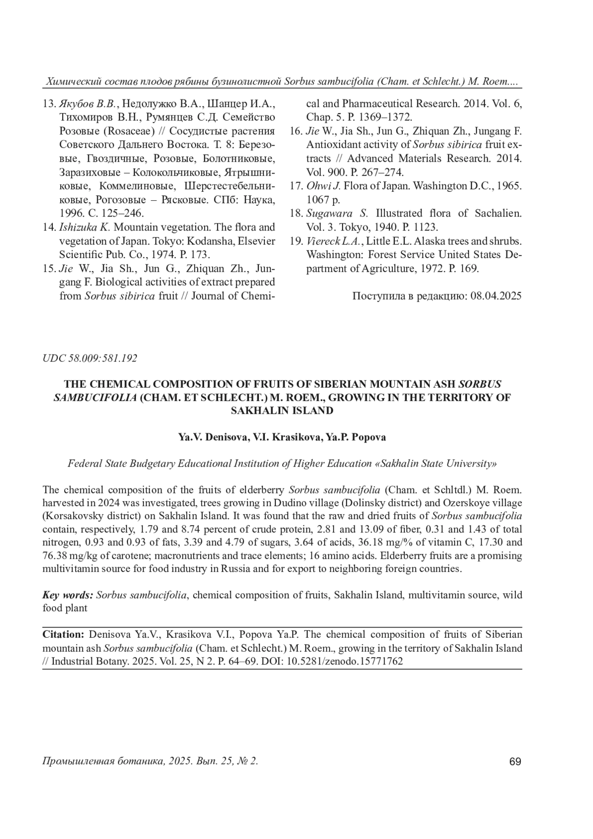 5. 	Денисова Я.В. Рябина бузинолистная в различных фитоценозах острова Сахалин. 2003. Деп. в ВИНИТИ № 1472-В2003 29.07.2003.