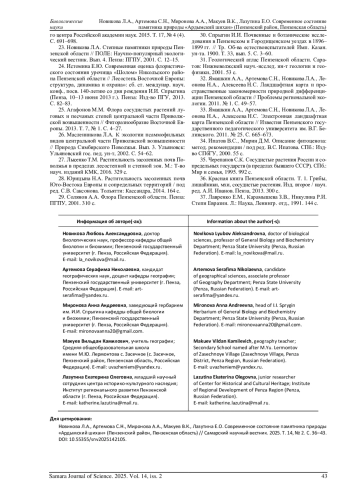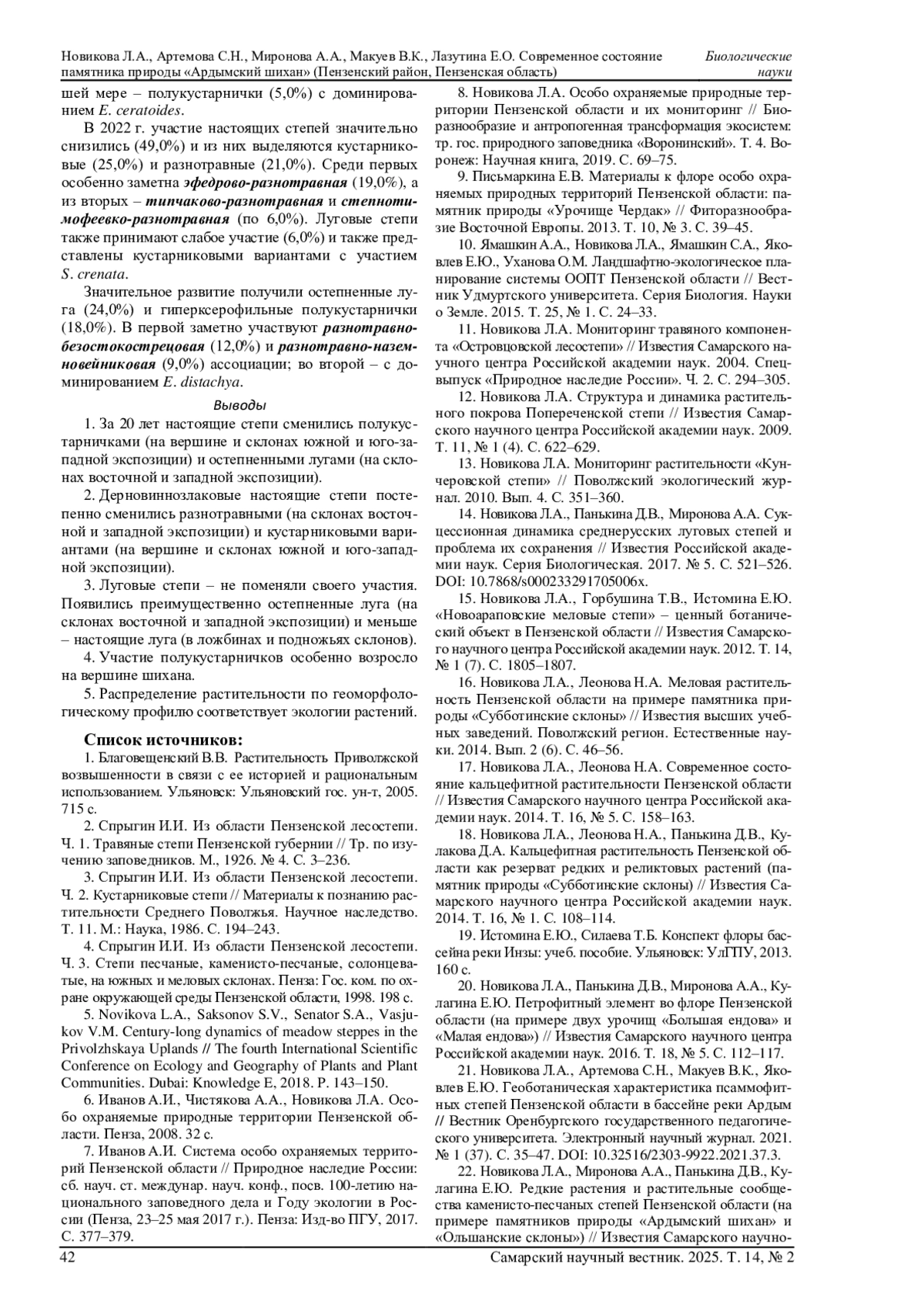 18. 	Новикова Л.А., Леонова Н.А., Панькина Д.В., Кулакова Д.А. Кальцефитная растительность Пензенской области как резерват редких и реликтовых растений (памятник природы “Субботинские склоны) // Известия Самарского научного центра Российской академии наук. 2014. Т. 16, № 1. С. 108-114. EDN: SKYBUB