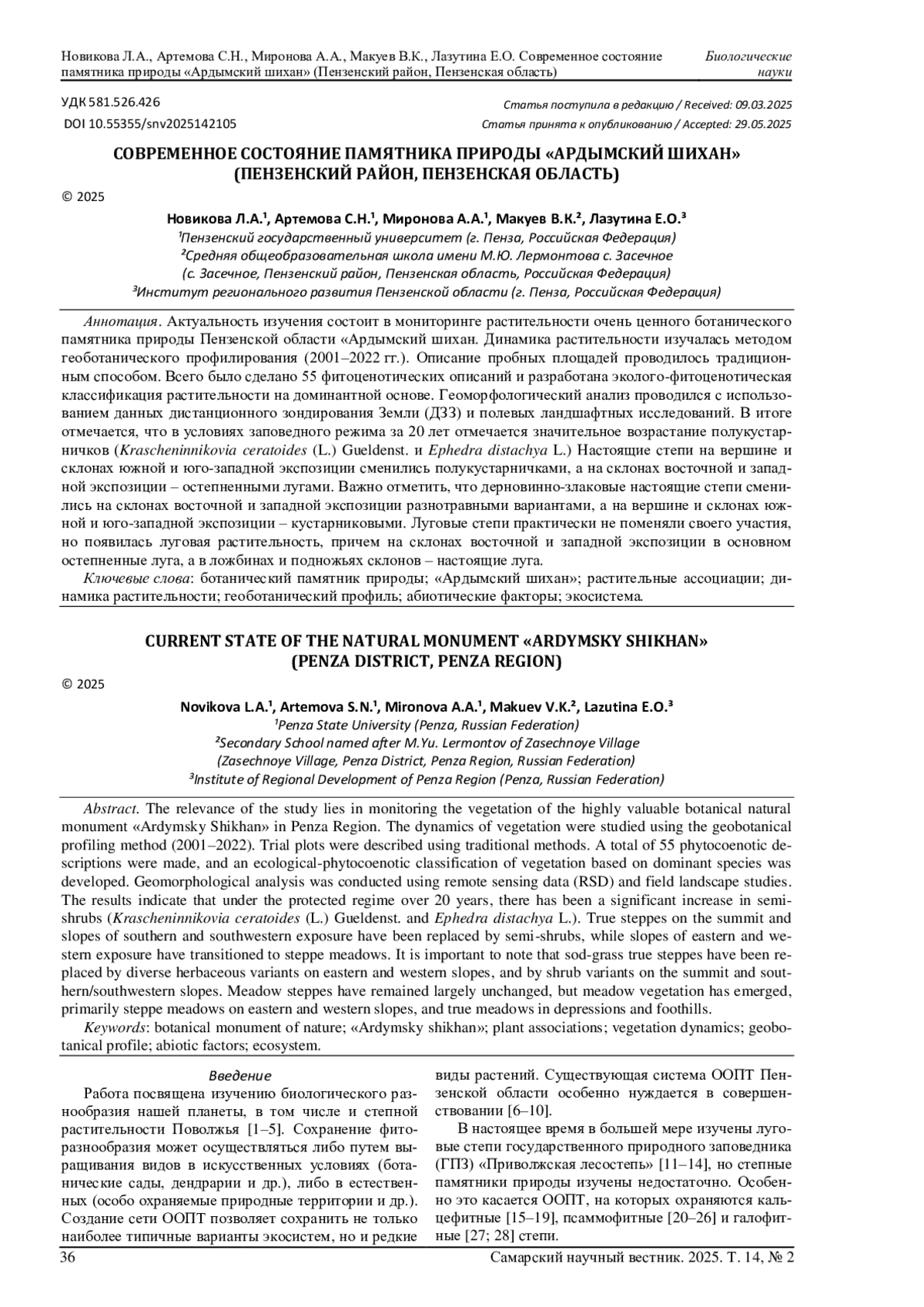 22. 	Новикова Л.А., Миронова А.А., Панькина Д.В., Кулагина Е.Ю. Редкие растения и растительные сообщества каменисто-песчаных степей Пензенской области (на примере памятников природы “Ардымский шихан” и “Ольшанские склоны”) // Известия Самарского научного центра Российской академии наук. 2015. Т. 17, № 4 (4). С. 691-698. EDN: WTPZDZ